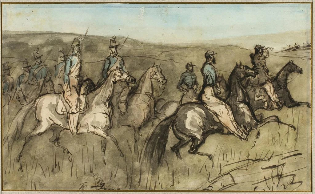 Exercice de cavalerie dans un pré : eine lebendige Szene voller Bewegung und Harmonie In dieser kunstdruckversion von Exercice de cavalerie dans un pré fängt Constantin Guys eine dynamische Szene ein, in der Reiter und Pferde in einem Ballett der Bewegungen verschmelzen. Die lebendigen Farben, die üppige Grüntöne mit erdigen Akzenten verbinden, spiegeln die Schönheit eines sonnigen Tages wider. Die Technik des Künstlers, die Aquarell und Zeichnung kombiniert, verleiht dem Gesamtwerk eine Leichtigkeit, während die Details der Pferde und Uniformen hervorgehoben werden. Die Atmosphäre, die von diesem Gemälde ausgeht, ist sowohl fröhlich als auch energiegeladen und lädt den Betrachter ein, die Aufregung des militärischen Übungsverfahrens zu spüren. Constantin Guys: ein Zeuge seiner Zeit Geboren 1802, gilt Constantin Guys oft als einer der ersten Künstler, die das moderne Leben durch ihre Kunst dokumentierten. Beeinflusst von der romantischen Bewegung, zeichnet er sich durch seine Fähigkeit aus, Szenen des Alltagslebens festzuhalten, insbesondere militärische Ereignisse und Landschaften. Im 19. Jahrhundert aktiv, hat Guys historische Momente verewigt und dabei eine persönliche Note in seine Werke eingebracht. Sein Stil, der sowohl realistisch als auch poetisch ist, zeugt von der Entwicklung der Kunst während einer Zeit großer Umbrüche in Europa und macht ihn zu einer unverzichtbaren Figur seiner Epoche. Eine dekorative Anschaffung mit vielfältigem Reiz Der kunstdruck von Exercice de cavalerie dans un pré ist ein dekoratives Stück, das Ihr Interieur bereichern wird, sei es im Wohnzimmer, im Büro oder im Schlafzimmer. Die Druckqualität garantiert eine bemerkenswerte Treue zu den Details des Originalwerks, während seine ästhetische Anziehungskraft einen dynamischen Akzent in Ihrer Dekoration setzt. Mit diesem Leinwandbild entscheiden Sie sich für ein Werk, das nicht nur einen Raum verschönert, sondern auch eine Geschichte erzählt – die einer Epoche, in der Kunst und militärisches Leben mit Eleganz und Leidenschaft miteinander verflochten waren.