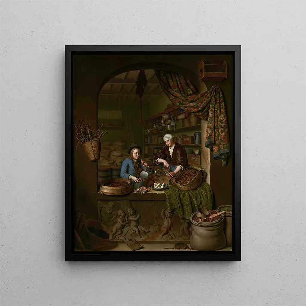 In Eine Feinkostladen zeigt van Mieris realistisch eine Ladenfront, in der sich Waren und Güter stapeln. Früchte, Gemüse, Brote, Krüge und Geschirr bilden ein Stillleben von unglaublicher Fülle, das den Geschmack der Zeit für Überfluss und Detailtreue widerspiegelt. Die Szene wird von Figuren belebt, deren alltägliche Gesten – wie Wiegen, Auswählen, Diskutieren – die Komposition dynamisieren und dem Gemälde Leben einhauchen.