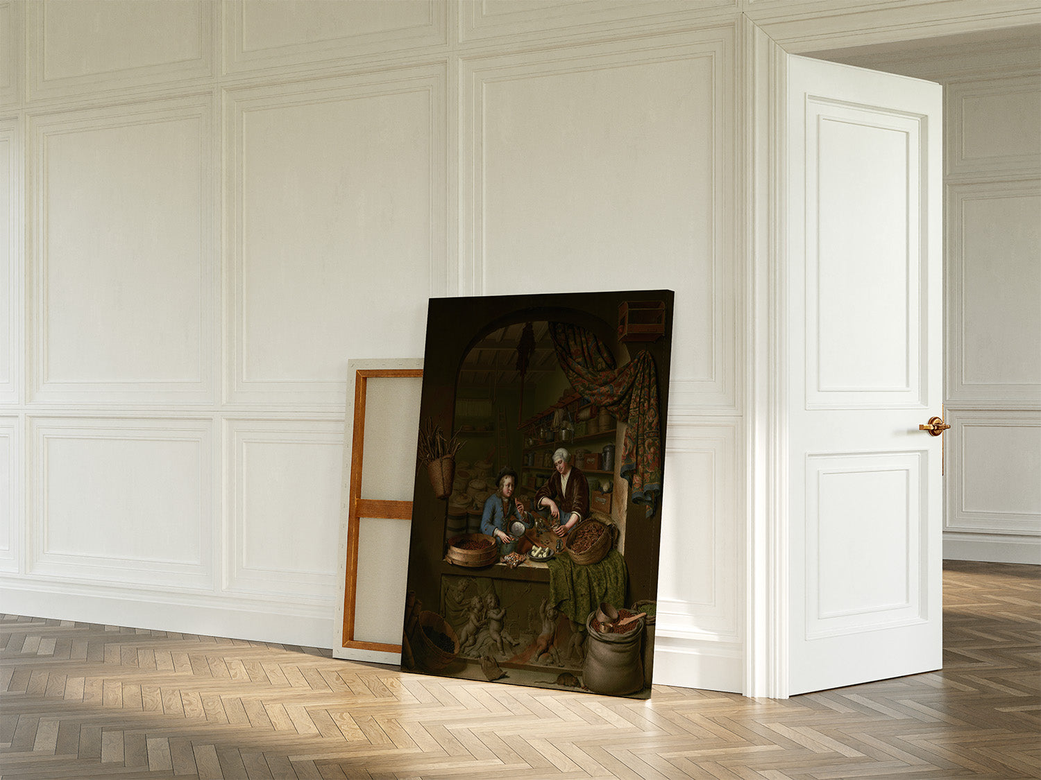 Der kunstdruck von Eine Feinkostladen von Willem van Mieris ist ideal, um Ihrer Dekoration einen Hauch von klassischer Raffinesse zu verleihen. Hängend in einer Küche, einem Esszimmer oder Wohnzimmer, betont er Geselligkeit, Überfluss und Sinnesfreude. Liebhaber holländischer Malerei werden die Eleganz der Genreszenen wiederfinden, während Geschichtsinteressierte das einzigartige Zeugnis des Alltags im 17. Jahrhundert schätzen.