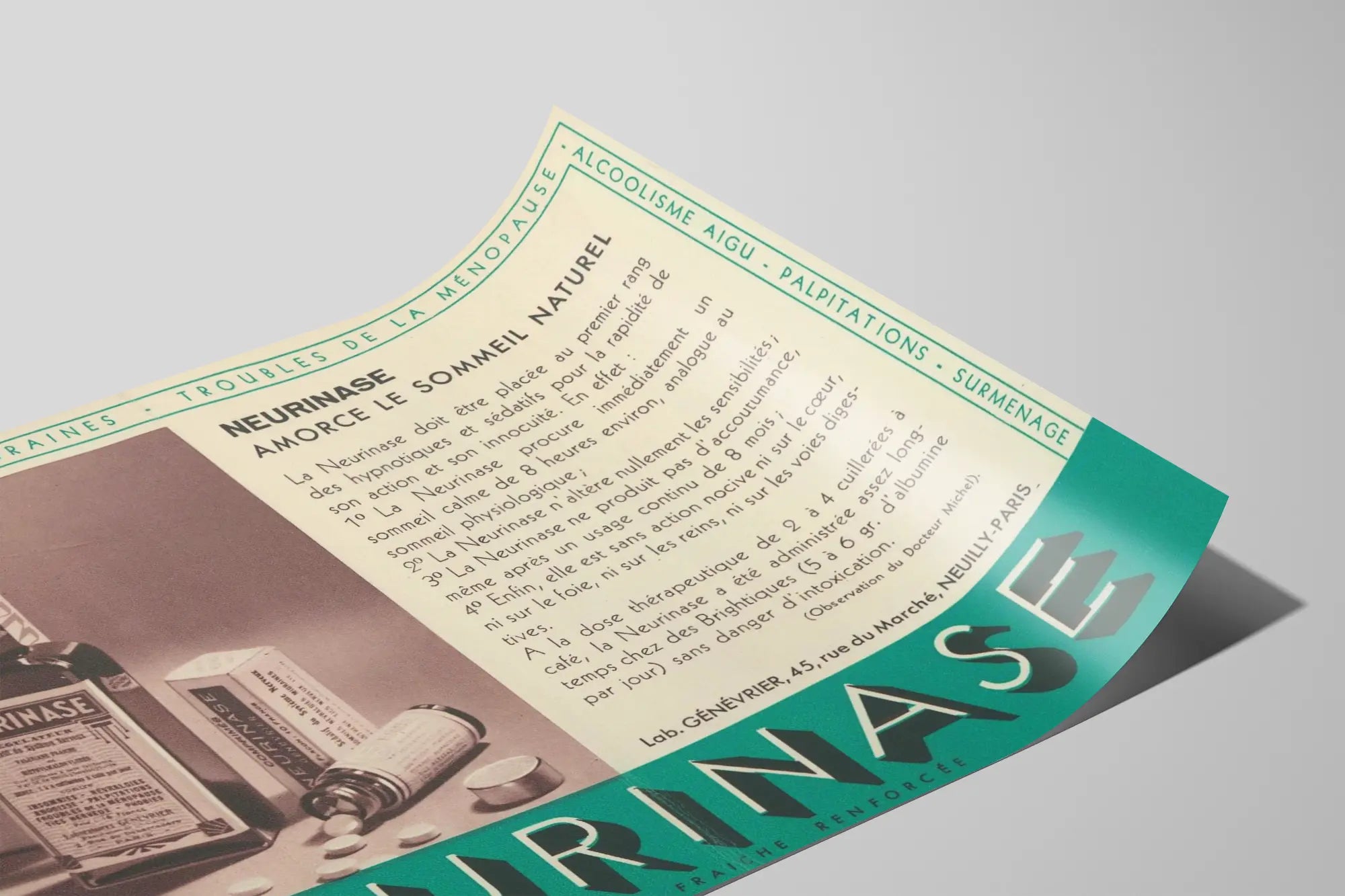 Diese Wanddekoration erinnert an die Versprechen des Produkts: einen natürlichen, ruhigen und beruhigenden Schlaf, mit schneller Wirkung und ohne schädliche Nebenwirkungen. Der Text, der einen alten typografischen Stil bewahrt, hebt die angeblichen Vorzüge von Neurinase hervor, insbesondere ihre Unbedenklichkeit, Nicht-Überempfindlichkeit und das Fehlen von Abhängigkeit, Eigenschaften, die damals mit medizinischen Argumenten betont wurden. Um das zentrale Bild herum beschreibt eine Randlinie die Beschwerden, die das Produkt gezielt behandelt, wie Schlaflosigkeit, Hysterie, Migräne, Menopause, akuten Alkoholismus und Überarbeitung.