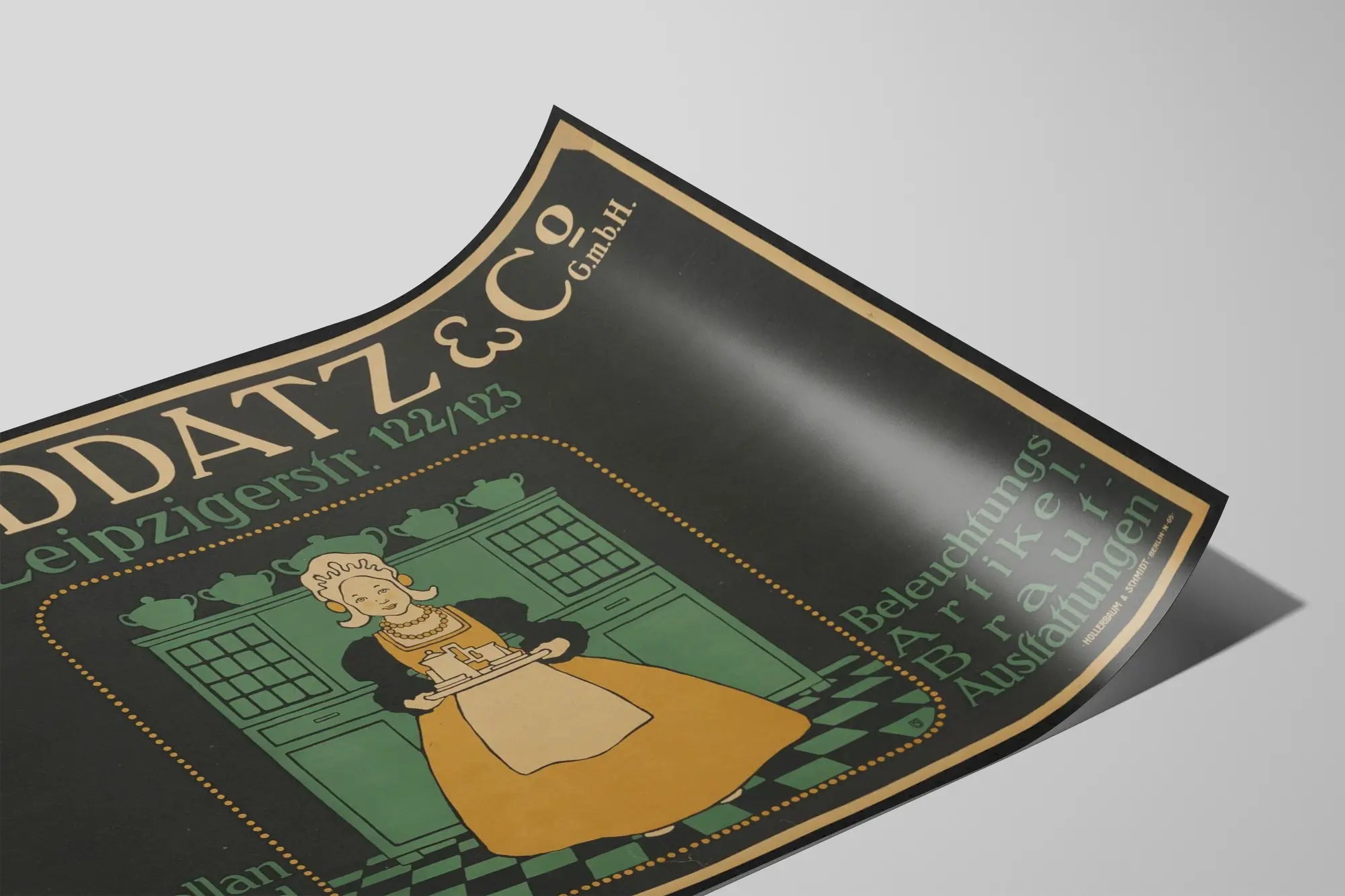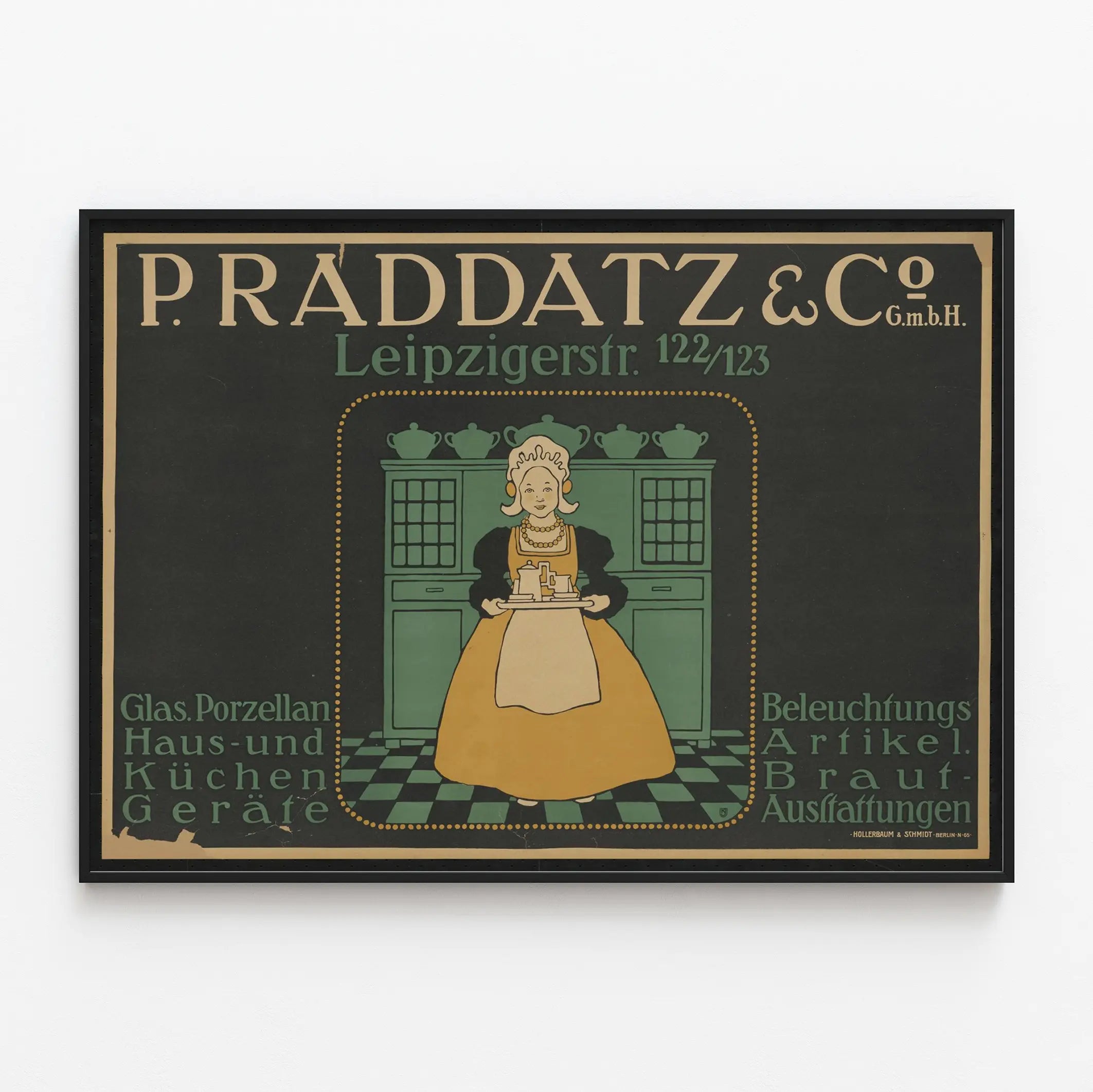 Entdecken Sie dieses vintage Werbeplakat für P. Raddatz & Co GmbH, eine elegante Wanddekoration, die perfekt ist, um Ihrem Interieur einen retro- und authentischen Akzent zu verleihen. Das Poster zeigt eine stilisierte Illustration einer Frau in traditioneller Tracht, die ein Tablett mit Teeservice hält, vor einem alten Buffet, und erinnert an eine kulinarische Welt vergangener Zeiten. Die vorherrschenden Farbtöne sind Grün, Ocker und Schwarz, die diesem Plakat einen dezenten und klassischen Charme verleihen. Ideal für eine Wanddekoration in einer Küche oder einem Esszimmer, erinnert dieses Vintage-Poster an die Kunst des Tischdeckens mit Hinweisen auf Produkte wie Glas, Porzellan, Küchengeräte sowie Beleuchtungs- und Hochzeitsdekorationen. Sein grafischer und typografischer Stil, typisch für den frühen 20. Jahrhundert, macht es zu einem einzigartigen Dekorationselement, das Ihre Wände elegant aufwertet. Das Plakat ist in einem schlichten Rahmen präsentiert, der das zentrale Motiv hervorhebt und die warme, einladende Atmosphäre eines traditionellen Heims unterstreicht. Es eignet sich perfekt für Liebhaber vintage Wanddekorationen, Sammler alter Plakate sowie für diejenigen, die ihren Raum mit einem Hauch von Geschichte und Authentizität personalisieren möchten. Sein klassisches Design lässt sich mühelos in verschiedene Einrichtungsstile integrieren, vom rustikalen bis zum modernen, und schafft einen originellen Kontrast. Dieses Werbeplakat ist mehr als nur ein Bild; es erzählt eine Geschichte über Handwerkskunst und die Sorgfalt im Umgang mit Alltagsgegenständen. Die hochwertige Druckqualität garantiert langlebige Farben, die Ihre Wanddekoration über viele Jahre verschönern werden. Setzen Sie auf dieses originelle Wandbild, um Ihrer Dekoration eine nostalgische und elegante Note zu verleihen und gleichzeitig ein unverzichtbares kulinarisches und häusliches Thema zu betonen. Dieses grafische Werk spiegelt die typografische und bildnerische Ästhetik einer Epoche wider und lässt sich geschmackvoll in Ihre Sammlung dekorativer Plakate integrieren.