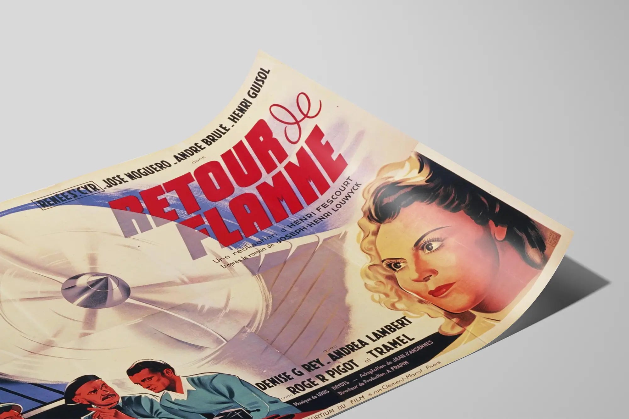 Dieses Vintage-Poster „Rückkehr der Flamme“ ist ein ikonisches Wanddekorationselement für Liebhaber des klassischen Kinos. Gedruckt im Retro-Stil zeigt es feinfühlig illustrierte Figuren mit ausdrucksstarken Zügen und eleganten Farben, die das goldene Zeitalter des Films heraufbeschwören. Das grafische Design verbindet warme und kalte Nuancen, wobei Rot- und Blautöne dominieren, und hebt den Titel in großen, dynamischen Buchstaben hervor. Das Motiv kontrastiert das leuchtende Frauenporträt rechts mit dem ernsten Männerprofil links und rahmt eine stilisierte Flugzeugpropeller in der Mitte ein – ein kraftvolles Symbol, das den Blick fängt und das Thema des Films erinnert. Dieses detailreiche Poster ist perfekt, um eine Wanddekoration zu bereichern und eine vintage Atmosphäre sowie einen zeitlosen filmischen Charme zu verleihen. Ideal für ein Wohnzimmer, ein Büro oder einen Kinoraum vermittelt dieses Wandbild eine visuelle Geschichte und weckt die Nostalgie vergangener Plakate. Mit diesem Poster in Ihrer Sammlung bringen Sie einen Hauch retro-Eleganz und ein Stück filmkulturelles Erbe in Ihr Zuhause.