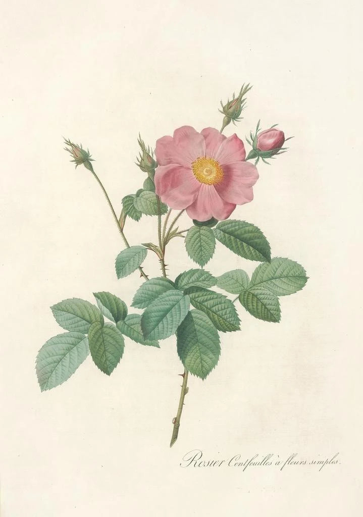 Pierre Joseph Redouté, eine ikonische Figur des 18. Jahrhunderts, ist bekannt für seine floralen Illustrationen, die Kunst und Wissenschaft verbinden. Seine Arbeiten wurden von den königlichen Gärten beeinflusst, und er hatte die Ehre, für den französischen Hof zu malen, insbesondere für Marie-Antoinette. Redouté konnte die Schönheit der Blumen so präzise einfangen, dass er oft als Pionier der botanischen Illustration gilt. „Rosa Centifolia Simplex“ ist eines seiner emblematischen Werke und zeugt von seinem außergewöhnlichen Talent und seiner Hingabe an die treue Darstellung der Natur.