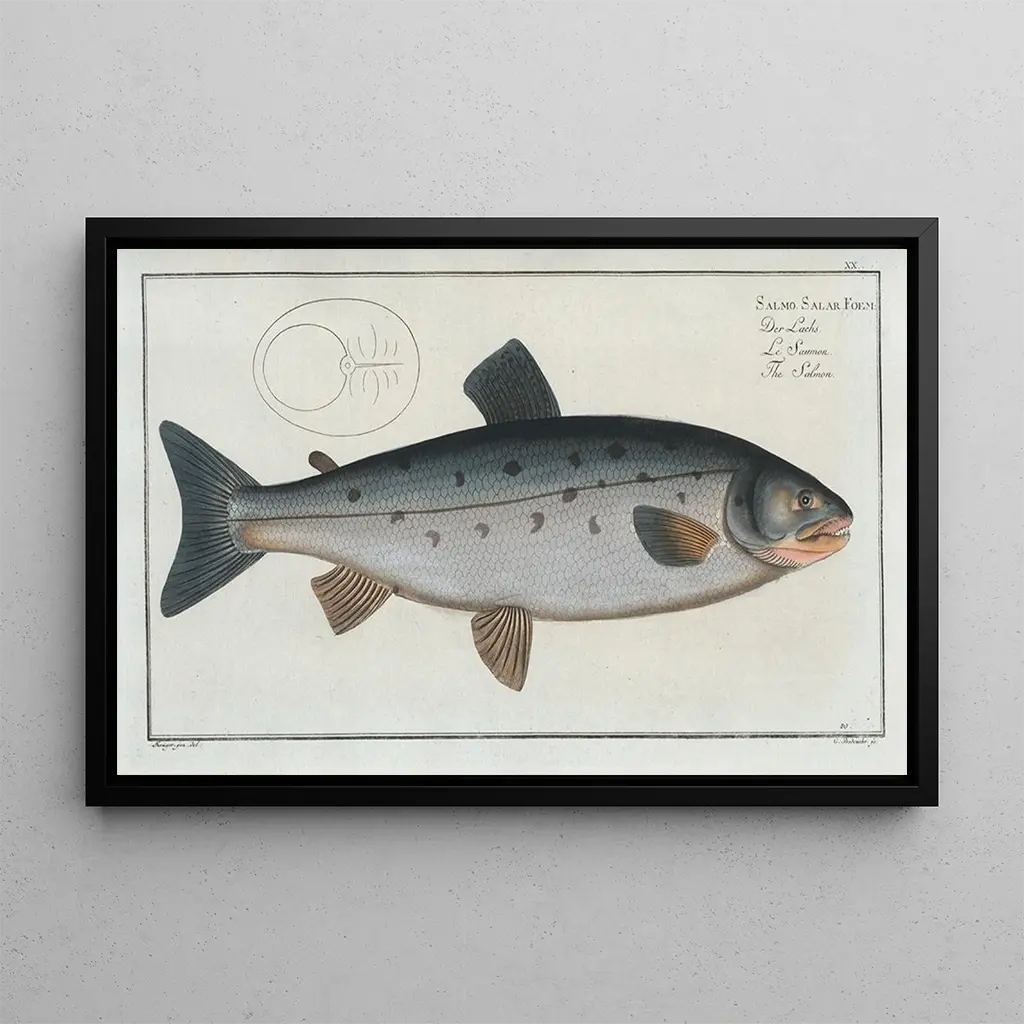 Salmo salar, der Lachs: eine Feier der aquatischen Natur Die kunstdruck von "Salmo salar, der Lachs" von Marcus Elieser Bloch ist ein faszinierendes Werk, das die Schönheit und Komplexität des aquatischen Lebens hervorhebt. Dieses Gemälde, reich an Details, zeigt den Lachs in seiner ganzen Pracht, mit lebendigen Farben und realistischen Texturen, die das Wesen dieses majestätischen Tieres einfangen. Der Künstler verwendet eine präzise Technik, um die schimmernden Schuppen und die Wasserreflexionen darzustellen, und schafft so eine lebendige und dynamische Atmosphäre. Dieses Werk lädt zu einer visuellen Erkundung der Unterwasserwelt ein und offenbart die Anmut und Kraft dieses emblematischen Fisches. Marcus Elieser Bloch: Pionier der zoologischen Illustration Marcus Elieser Bloch, naturalist und deutscher künstler des 18. Jahrhunderts, ist bekannt für seine Beiträge zur zoologischen Illustration. Seine Werke, die Kunst und Wissenschaft verbinden, spielten eine wesentliche Rolle bei der Dokumentation der Meeresarten. Bloch reiste durch Europa, beobachtete und studierte die aquatische Fauna, was ihm ermöglichte, Illustrationen mit bemerkenswerter Präzision zu erstellen. "Salmo salar" ist Teil seines monumentalen Werks "Ichthyologie", das die nachfolgenden Generationen von Künstlern und Wissenschaftlern beeinflusst hat. Sein akribischer Ansatz und seine Liebe zum Detail machen ihn zu einer unverzichtbaren Figur in der Geschichte von Kunst und Biologie. Eine dekorative anschaffung mit vielfältigen vorteilen Der kunstdruck von "Salmo salar, der Lachs" ist eine ideale dekorative Wahl für Natur- und Kunstliebhaber. Ob im Büro, Wohnzimmer oder in der Küche, dieses Leinwandbild bringt eine Note von Eleganz und Originalität in Ihr Zuhause. Die Druckqualität und die Treue zum Originalwerk garantieren eine beeindruckende visuelle Darstellung, die alle Aufmerksamkeit auf sich zieht. Durch die Hinzufügung dieses Werks zu Ihrer Sammlung bereichern Sie nicht nur Ihren Lebensraum, sondern feiern auch die Schönheit der aquatischen Biodiversität, sodass jeder Blick eine Einladung zur Entdeckung ist.