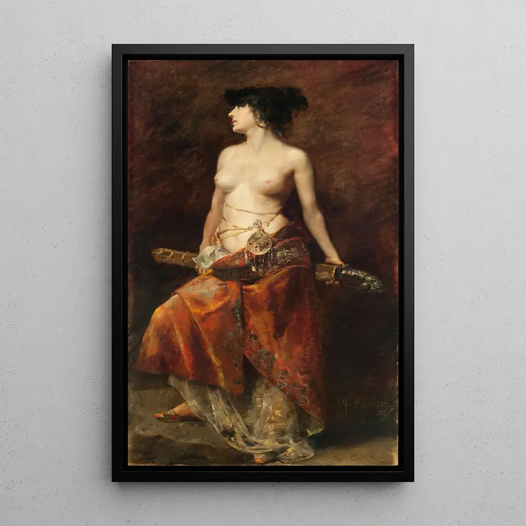 Das Salomé-Kunstdruck von Francesc Masriera fängt einen Moment dramatischer Spannung ein, in dem die berühmte biblische Figur im Mittelpunkt einer emotional aufgeladenen Szene steht. Die reichen und tiefgründigen Farben, wie Rot und Gold, wecken sowohl Sinnlichkeit als auch Gefahr. Die Technik von Masriera, die Realismus mit symbolistischen Elementen verbindet, schafft eine fesselnde Atmosphäre, in der jedes Detail – vom Kostüm Salomés bis zum Ausdruck ihres Gesichts – eine komplexe Geschichte erzählt. Dieser Kunstdruck lädt dazu ein, die Themen Verführung und Macht zu erkunden und bietet gleichzeitig eine einzigartige künstlerische Sicht auf diese ikonische Figur.