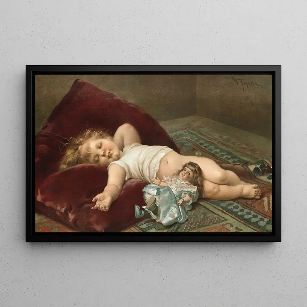 Virgilio Tojetti, italienischer Maler des 19. Jahrhunderts, ist bekannt für seine Genre-Szenen und Porträts, die von Realismus geprägt sind. Beeinflusst vom Romantizismus, konnte er intime und bewegende Momente des Alltags festhalten. Tojetti hat häufig Kinder dargestellt, wobei er ihre Unschuld und natürliche Schönheit hervorhob. Seine Karriere, obwohl weniger bekannt als die einiger Zeitgenossen, hat einen bleibenden Eindruck in der Kunstwelt hinterlassen. "Bébé endormi" ist ein perfektes Beispiel für sein Talent und zeigt seine Fähigkeit, flüchtige Momente mit großer emotionaler Tiefe einzufangen.