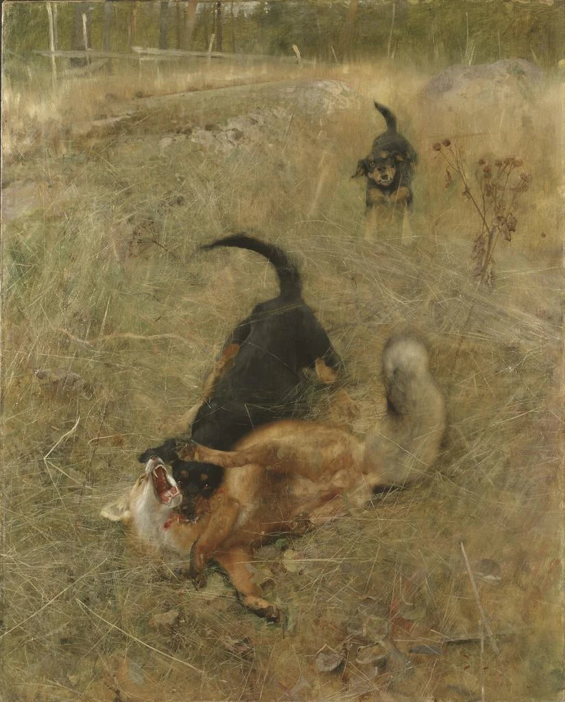 Liljefors' Werk zeichnet sich durch eine außergewöhnliche Beherrschung von Licht und Farbe aus. Das Spiel von Schatten und Licht erweckt die feinsten Details des Fuchshundes und des Fuchsfells zum Leben. Jeder Pinselstrich scheint voller Emotionen zu sein, enthüllt nicht nur die Textur der Tiere, sondern auch die umgebende Atmosphäre. Die gewählte Farbpalette, die zwischen warmen Tönen und kühleren Nuancen schwankt, evoziert den Übergang zwischen Tag und Nacht, einen Moment des Schwebezustands, in dem die Natur gleichzeitig ruhig und voller Spannung ist. Liljefors gelingt es, eine immersive Atmosphäre zu schaffen, in der sich der Betrachter fast eingeladen fühlt, an dieser Szene des wilden Lebens teilzunehmen. Sein Stil, zugleich realistisch und poetisch, zeugt von einem tiefen Verständnis für die Tierwelt und einem unerschütterlichen Respekt für ihren natürlichen Lebensraum.