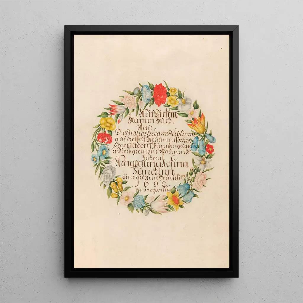Die kunstdruck der Page de dédicace avec date, gefertigt von Magdalena Rosina Funck, ist ein wahres Meisterwerk der kalligraphischen Kunst. Dieses zarte Werk präsentiert ein elegantes Layout, bei dem die Buchstaben anmutig verflochten sind und eine fesselnde visuelle Harmonie schaffen. Die gewählten Farben, oft in Gold und Blau, verleihen der Komposition eine wertvolle Dimension. Die raffinierte Technik von Funck, die Malerei und Schrift kombiniert, erinnert an eine Epoche, in der jedes Detail sorgfältig durchdacht wurde. Diese Page de dédicace, viel mehr als nur ein einfaches Dokument, wird zu einem eigenständigen Kunstwerk und lädt zur Betrachtung ein.