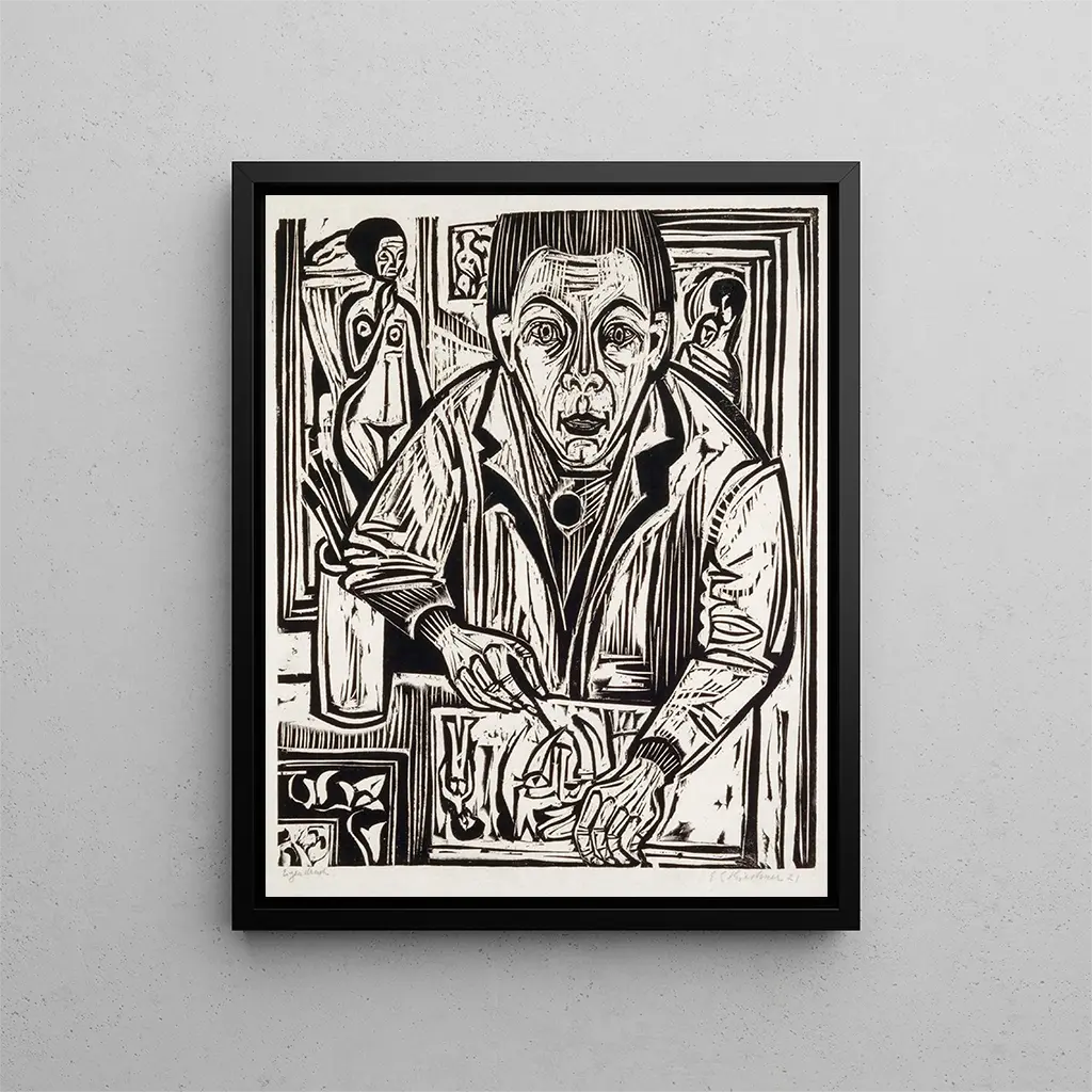 Reproduktion Selbstporträt Holzschnitt - Ernst Ludwig Kirchner – Faszinierende Einführung Das Werk "Selbstporträt Holzschnitt" von Ernst Ludwig Kirchner ist ein Meisterwerk, das die Essenz des Expressionismus verkörpert. In diesem Werk begibt sich der Künstler auf eine tiefgehende Selbstreflexion und fängt nicht nur sein Bild, sondern auch seinen turbulenten Geisteszustand ein. Die Wahl des Holzes als Trägermaterial für dieses Selbstporträt zeugt von dem Wunsch, zu rohen Materialien zurückzukehren, und spiegelt die Natur der Kunst und Authentizität wider. Kirchner, Gründungsmitglied der Gruppe Die Brücke, suchte stets danach, die künstlerischen Konventionen seiner Zeit zu überwinden, und dieses Werk ist eine eindrucksvolle Illustration dafür. Es lädt den Betrachter ein, in die innere Welt des Künstlers einzutauchen, die Emotionen zu spüren, die ihn bewegen, und die Komplexität seiner Identität zu entdecken. Stil und Einzigartigkeit des Werks Der Stil von Ernst Ludwig Kirchner ist geprägt von kühnen Linien und leuchtenden Farben, charakteristisch für den Expressionismus. In "Selbstporträt Holzschnitt" verbinden sich diese Elemente zu einem Bild, das sowohl beeindruckend als auch verstörend ist. Die Verwendung des Holzes als graviertes Medium verleiht dem Werk eine einzigartige Textur und fügt eine taktile Dimension hinzu, die zur Erkundung einlädt. Kirchner spielt mit Schatten und Licht, hebt die Züge seines Gesichts auf eine Weise hervor, die sowohl realistisch als auch stilisiert erscheint. Diese Dualität verstärkt die Botschaft des Werks: Der Künstler ist sowohl Beobachter als auch Subjekt, ein Mann, der von seinen eigenen Dämonen heimgesucht wird, aber auch ein Schöpfer auf der Suche nach Wahrheit. Die Konturen seines Gesichts, manchmal kantig, manchmal weichgezeichnet, zeugen von seinem inneren Kampf und verleihen diesem Werk eine seltene emotionale Kraft. Der Künstler und sein Einfluss Ernst Ludwig Kirchner, eine ikonische Figur des deutschen Expressionismus, prägte seine Epoche durch seinen innovativen Ansatz in Malerei und Gravur. Geboren 1880, wurde er von den künstlerischen Bewegungen seiner Zeit beeinflusst, entwickelte aber einen eigenen Stil. Kirchner erforschte häufig Themen im Zusammenhang mit Modernität, Entfremdung und Psychologie.