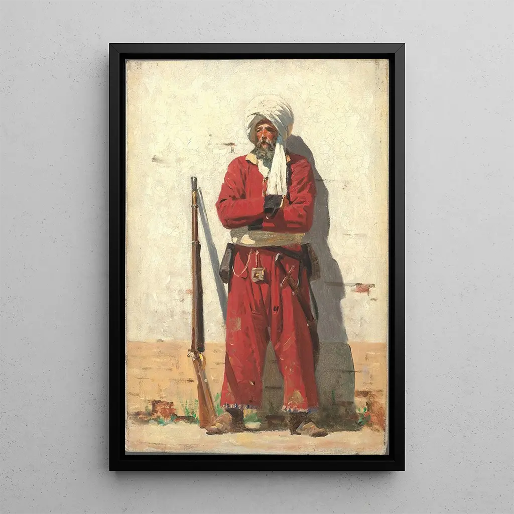 Das "Soldat von Kokand" von Vasily Vereshchagin ist ein beeindruckendes kunstdruck, das einen Krieger in traditioneller Kleidung zeigt, Symbol für Mut und kulturelles Erbe Zentralasiens. Die Komposition hebt die Figur im Vordergrund hervor, mit detaillierten Darstellungen seiner Uniform und Accessoires. Die reichen Farben, von erdigen Tönen bis hin zu roten Akzenten, schaffen eine lebendige und dynamische Atmosphäre. Vereshchagin gelingt es, die Intensität des Moments zu vermitteln, den Geist des Kriegers einzufangen und gleichzeitig die Schönheit der lokalen Traditionen zu würdigen.