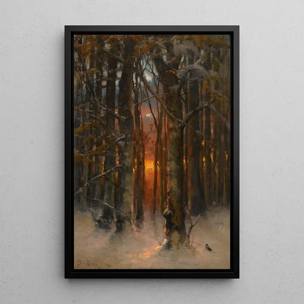 In dieser kunstdruck-Version des Sonnenuntergangs durch die Bäume bietet uns Julius Sergius Klever eine atemberaubende Szenerie, in der das Sonnenlicht mit dichtem Laub verschmilzt. Die warmen Orangetöne und Rosatöne verschmelzen harmonisch und schaffen eine beruhigende, kontemplative Atmosphäre. Klevers Technik, gekennzeichnet durch zarte Pinselstriche und eine besondere Liebe zum Detail, erweckt diese natürliche Landschaft zum Leben. Jedes Element, von den Baumstämmen bis zu den Himmelreflexen, trägt zu einer ausgewogenen Komposition bei, die zum Träumen und Entfliehen einlädt.