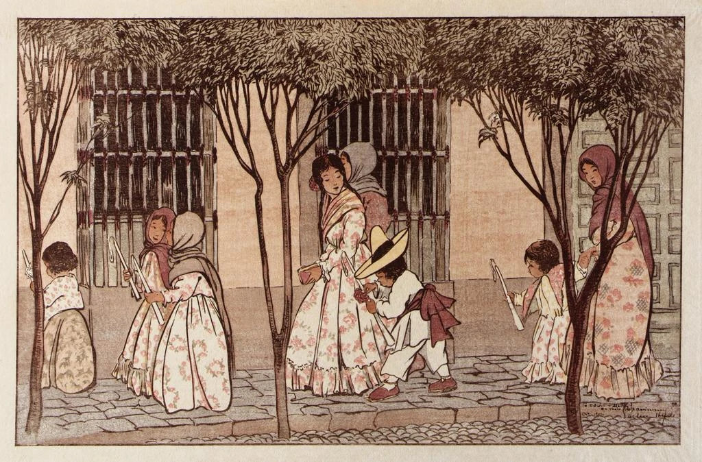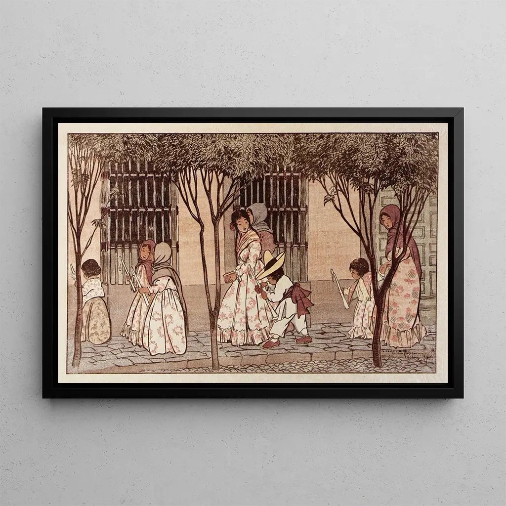 Die kunstdruck von Dimanche matin von Helen Hyde evoziert eine ruhige und intime Szene, in der das sanfte Morgenlicht die Gesichter der Figuren streichelt. Die Pastellfarben, zart und beruhigend, schaffen eine Atmosphäre der Gelassenheit. Die Technik der Künstlerin, die geschickt Aquarell und Gravur verbindet, erweckt diese Komposition zum Leben, bei der jedes Detail eine Geschichte zu erzählen scheint. Die Ausdrücke der Figuren, in ihre Gedanken vertieft, laden zur Betrachtung und Träumerei ein und versetzen den Betrachter in einen in der Zeit schwebenden Moment.