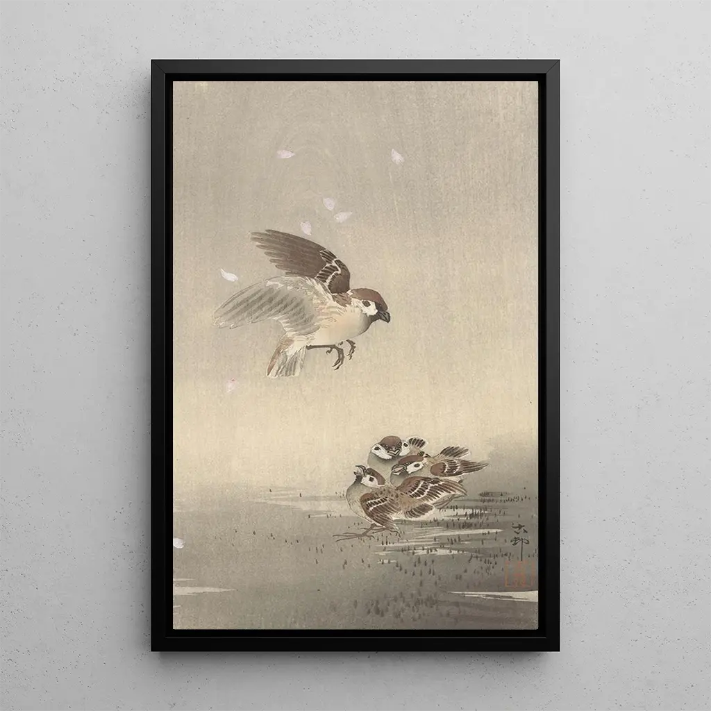 In dieser kunstdruck-Version des Gemäldes "Moineau friquet avec jeune" fängt Ohara Koson einen zarten Moment der Natur ein. Die sanften Farben und die subtilen Nuancen von Braun und Beige erzeugen eine ruhige Atmosphäre, während die Technik des japanischen Drucks die Feinheit der Details hervorhebt. Der moineau, mit großer Präzision dargestellt, scheint auf seinen kleinen zu wachen, und schafft eine berührende Szene, die zur Betrachtung einlädt. Der verschwommene Hintergrund verstärkt die Schlichtheit und Eleganz dieser Interaktion zwischen Mutter und Jungem und bietet eine beruhigende Sicht auf das wilde Leben.