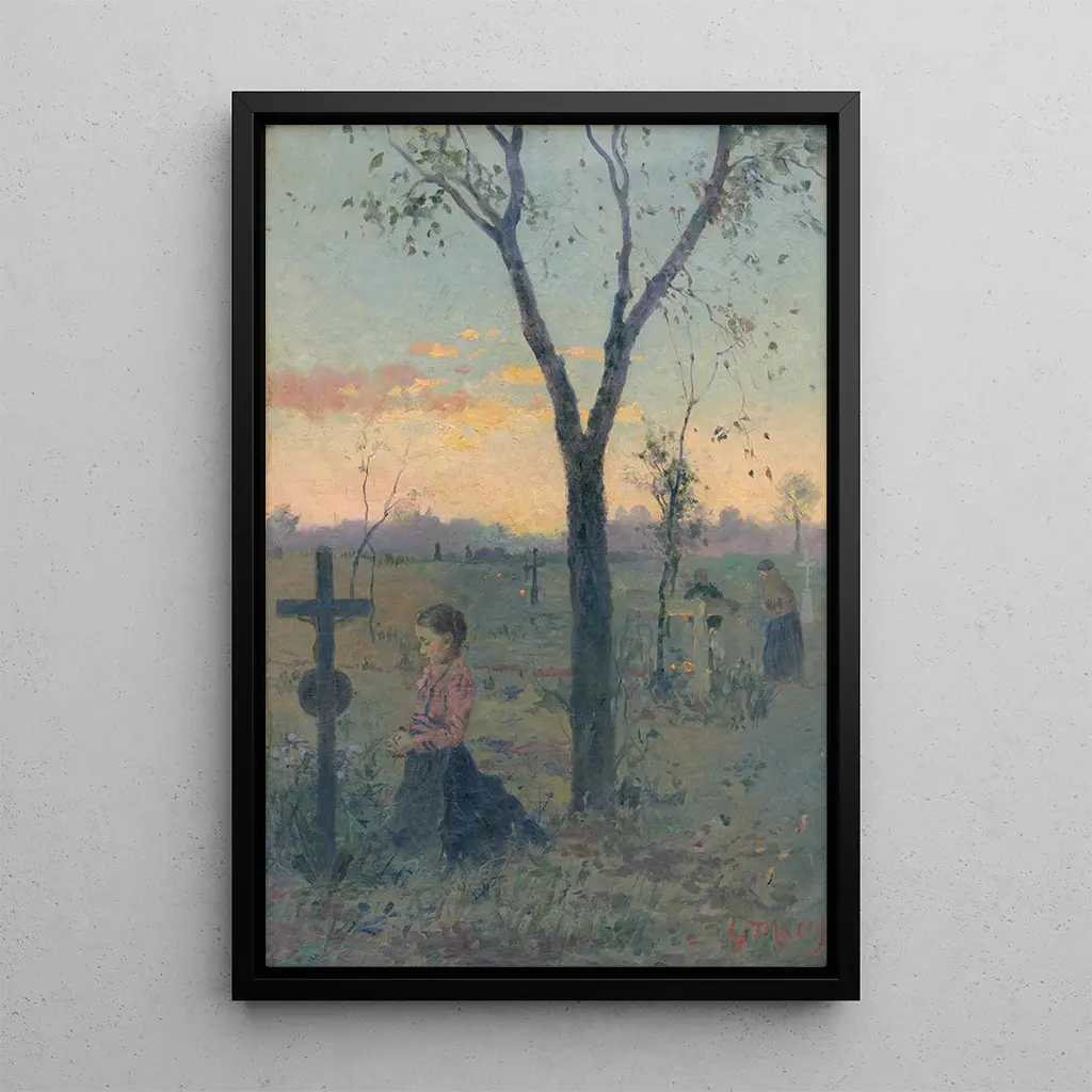 Die reproduction von "Stille Gebets auf einem Grab" vermittelt eine Atmosphäre voller Gelassenheit und Traurigkeit. Die dunklen Farben und die zarten Nuancen verschmelzen zu einer Leinwand, die zur Reflexion einlädt. Die Technik des Künstlers, der mit Schatten und Licht spielt, verstärkt die Emotionen, die von diesem Werk ausgehen. Jeder Pinselstrich scheint eine Geschichte zu erzählen, die einer stillen Hommage, einer bewahrten Erinnerung. Dieses Werk, zugleich einfach und tiefgründig, entführt uns in eine Welt, in der die Zeit stillzustehen scheint, und lädt uns ein, die Schönheit des Vergänglichen zu bewundern.