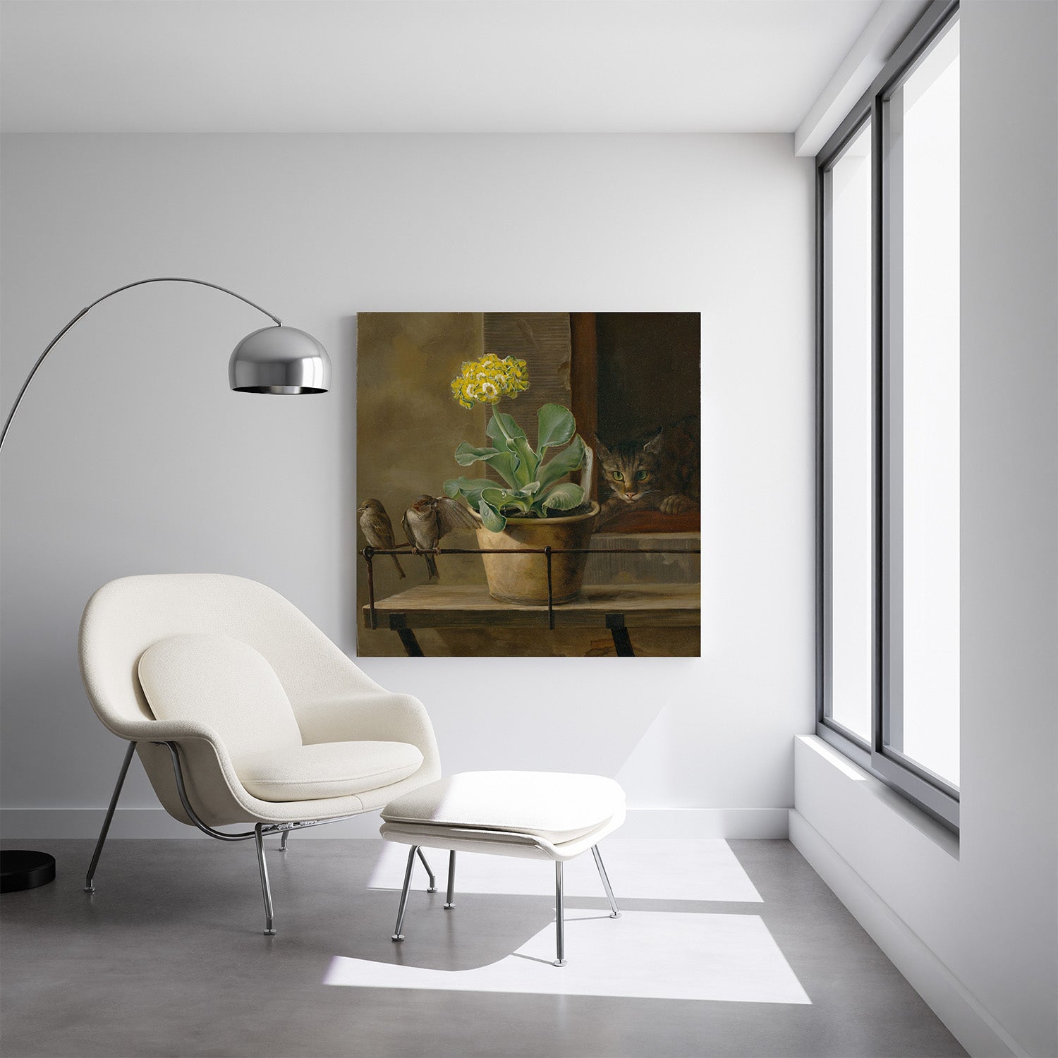 Diese kunstdruck Stillleben mit einer Primel in einem Blumentopf, einer Katze und zwei Spatzen ist ideal, um ein Wohnzimmer, ein Büro oder ein Gästezimmer aufzuwerten und verleiht eine dezente Eleganz und häusliche Wärme. Das Gemälde eignet sich sowohl für eine isolierte Anbringung als auch für eine ambitionierte Wandkomposition. Das angebotene Leinwandmaterial bewahrt die chromatische Treue und die Struktur des Originals, garantiert eine schöne visuelle Präsenz und eine langlebige Qualität, die sich für zeitgenössische Innenräume eignet. Die Wahl dieses Leinwanddrucks bedeutet, in Ihren Raum ein Werk einzuladen, das sowohl erzählerisch als auch beruhigend wirkt – perfekt, um eine raffinierte und einladende Atmosphäre zu schaffen.