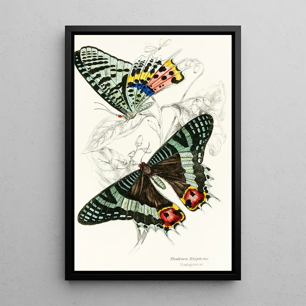 Thaliura Rhipheus : eine farbenfrohe Tanz der Natur Der kunstdruck von Thaliura Rhipheus entführt uns in eine Welt, in der leuchtende Farben und zarte Formen aufeinandertreffen. Dieses Gemälde, das einen Schmetterling mit Flügeln zeigt, die mit faszinierenden Mustern verziert sind, ruft die Leichtigkeit und Anmut dieses Wesens hervor. Die lebhaften Töne von Blau, Rot und Gelb vermischen sich harmonisch und schaffen eine fröhliche, dynamische Atmosphäre. Die Technik des Künstlers, die Präzision und Flüssigkeit verbindet, lässt die Bewegung des Schmetterlings spüren, als ob er gleich abheben würde. Jedes Detail ist sorgfältig ausgeführt, was dieses Werk zu einer wahren Hommage an die Schönheit der Natur macht. James Duncan : ein Pionier der künstlerischen Entomologie James Duncan, eine bedeutende Figur des 19. Jahrhunderts, verstand es, Kunst und Wissenschaft durch seine Insektenillustrationen zu verbinden. Seine Leidenschaft für die Natur und sein Wunsch, sie genau darzustellen, führten ihn dazu, Werke zu schaffen, die sowohl künstlerisch als auch lehrreich sind. Beeinflusst von den wissenschaftlichen Entdeckungen seiner Zeit, trug Duncan zur Dokumentation der Arten bei und machte seine Werke zu Referenzen im Bereich der Entomologie. Sein einzigartiger Stil, der Realismus und Sensibilität vereint, hinterließ einen bleibenden Eindruck in der Geschichte der naturalistischen Kunst und feiert die Vielfalt und Schönheit der lebenden Welt. Eine dekorative Anschaffung mit vielfältigen Vorteilen Eine reproduktion von Thaliura Rhipheus zu wählen, bedeutet, einen Farbtupfer und Leben in Ihre Inneneinrichtung zu bringen. Ob im Wohnzimmer, im Büro oder im Schlafzimmer, diese Leinwand sorgt für eine warme und einladende Atmosphäre. Die Qualität der reproduktion garantiert eine Treue zu den Details und Farben des Originalwerks, sodass Sie seine ästhetische Anziehungskraft voll genießen können. Indem Sie dieses Werk in Ihren Raum integrieren, laden Sie die Schönheit der Natur ein, bei Ihnen zu erblühen, und würdigen gleichzeitig die Kunst eines Schöpfers, der das Wesen der natürlichen Wunder eingefangen hat.