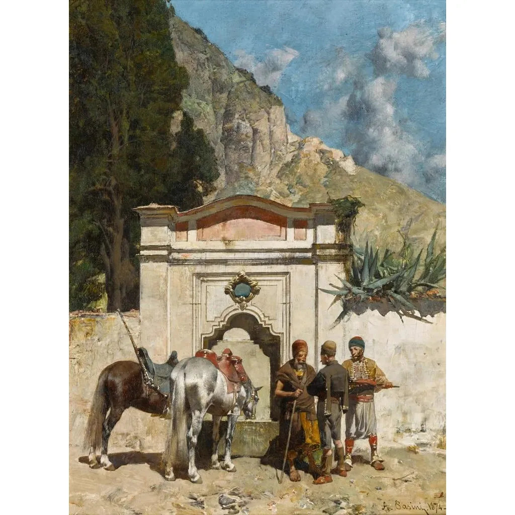 Alberto Pasini, geboren 1826, war ein italienischer Maler, der sich im orientalistischen Strom des 19. Jahrhunderts durchsetzen konnte. Seine Leidenschaft für Reisen führte ihn dazu, Regionen wie Ägypten und Algerien zu erkunden, was seine Werke tief beeinflusste. Durch die Integration lokaler Kultur und exotischer Landschaften schuf Pasini Gemälde, die Geschichten erzählen und gleichzeitig die Schönheit dieser Länder einfangen. Seine Arbeiten wurden für ihre Fähigkeit gelobt, Realismus und Romantik zu verbinden und so eine einzigartige Vision des Orients für seine Zeitgenossen zu bieten.