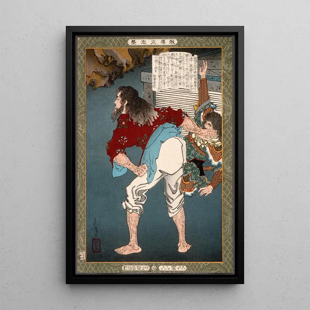Tsuki no Kishi Ikina : ein Tanz unter dem Mond In diesem fesselnden Werk entführt uns Tsuki no Kishi Ikina, Tsukioka Yoshitoshi, in ein nächtliches Universum voller Geheimnisse und Schönheit. Die lebendigen Farben und die auffälligen Kontraste schaffen eine bezaubernde Atmosphäre, in der der Mond die Figuren zart erleuchtet. Die Ukiyo-e-Printtechnik, in der Yoshitoshi meisterhaft ist, erweckt detaillierte Feinheiten, zarte Texturen und eine beeindruckende Tiefe zum Leben. Jedes Element der Komposition scheint eine Geschichte zu erzählen und lädt den Betrachter ein, in diese poetische und zeitlose Szene einzutauchen. Tsukioka Yoshitoshi : der Meister des modernen Ukiyo-e Tsukioka Yoshitoshi, geboren 1839, ist einer der letzten großen Meister des Ukiyo-e, eines japanischen Druckstils, der im 17. Jahrhundert seinen Höhepunkt erreichte. Beeinflusst von den sozialen und politischen Umbrüchen seiner Zeit, verstand es Yoshitoshi, Tradition und Innovation zu verbinden, und schuf Werke, die sowohl die Schönheit der natürlichen Welt als auch menschliche Kämpfe widerspiegeln. Seine Karriere, geprägt von Phasen des Ruhms und der Schwierigkeiten, hinterließ ein unvergängliches künstlerisches Erbe und macht ihn zu einer unverzichtbaren Figur in der Geschichte der japanischen Kunst. Seine Werke, wie Tsuki no Kishi Ikina, zeugen von seinem kreativen Genie und seiner Fähigkeit, das Wesen des Vergänglichen einzufangen. Eine dekorative Reproduktion mit vielfältigen Vorzügen Die Reproduktion von Tsuki no Kishi Ikina ist ein dekoratives Stück, das jeden Raum bereichern wird, sei es ein Wohnzimmer, ein Büro oder ein Schlafzimmer. Die Druckqualität und die Treue zu den Details des Originalwerks machen sie zur idealen Wahl für Kunstliebhaber und Fans der japanischen Kultur. Die ästhetische Anziehungskraft dieses Posters liegt in seiner Fähigkeit, Emotionen hervorzurufen und zur Kontemplation einzuladen. Durch die Integration dieser Reproduktion in Ihre Dekoration verleihen Sie Ihrem Raum Eleganz und Ruhe und feiern gleichzeitig das künstlerische Erbe Yoshitoshis.