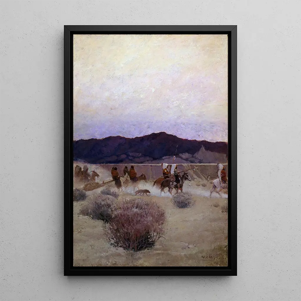 In "Lagerplatzwechsel" fängt N. C. Wyeth die Essenz eines Abenteuers im Freien ein. Das Leinwandbild zeigt eine Gruppe von Pionieren, die ihre Sachen packen, umgeben von üppiger Natur. Die warmen, erdigen Farben vermitteln eine Atmosphäre von Kameradschaft und Entschlossenheit. Das sanfte Licht der Dämmerung erleuchtet die Gesichter, während die detaillierten Darstellungen der Ausrüstung und Kleidung auf eine besondere Aufmerksamkeit für Authentizität hinweisen. Dieses Werk lädt den Betrachter ein, den Duft feuchter Erde und das Rascheln der Blätter unter den Füßen zu spüren, und schafft so eine vollständige Immersion in diesen Übergangsmoment.