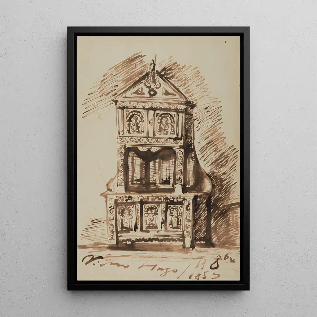 Das Gemälde "Ein Buffet" von Victor Hugo entführt uns in eine Welt, in der Handwerkskunst auf Natur trifft. Die Komposition, reich an Details, hebt ein geschnitztes Holzmöbel hervor, verziert mit zarten Blumenmotiven. Die warmen Farben, die von tiefen Brauntönen bis zu sanften Grüntönen reichen, schaffen eine einladende und warme Atmosphäre. Die Maltechnik Hugos, die Realismus und Romantik verbindet, erweckt dieses Alltagsobjekt zum Leben und verwandelt es in ein vollwertiges Kunstwerk. Jeder Pinselstrich scheint eine Geschichte zu erzählen und lädt den Betrachter ein, die Schönheit der einfachen Dinge zu bewundern.