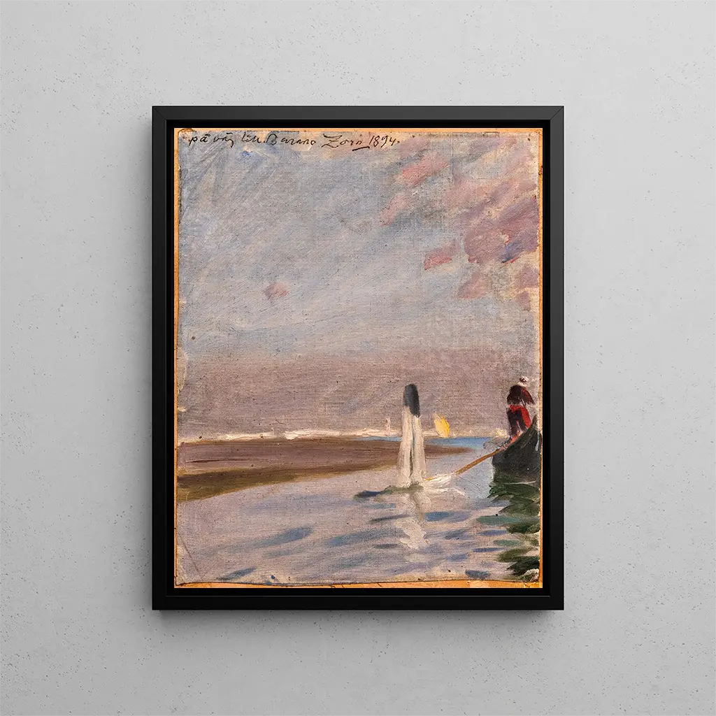 Reproduktion Auf dem Weg nach Burano - Anders Zorn – Faszinierende Einführung Im weiten Panorama der Kunstgeschichte gelingt es manchen Werken, ihre Epoche zu transzendieren und die Essenz eines Ortes, einer Kultur oder eines Moments einzufangen. "Auf dem Weg nach Burano", geschaffen vom schwedischen Meister Anders Zorn, ist ein perfektes Beispiel dafür. Dieses Gemälde, durchdrungen von Licht und Bewegung, evoziert nicht nur die malerische Schönheit der Insel Burano, sondern lädt den Betrachter auch zu einer Eintauchen in die lebendige Atmosphäre der venezianischen Lagune ein. Das Auge wird von den schillernden Nuancen des Meeres und der bunten Häuser getragen, während die menschlichen Figuren, gekleidet in traditionelle Kostüme, eine alltägliche Szene voller Poesie zu leben scheinen. Zorn bietet uns durch dieses Werk eine visuelle Reise, die den einfachen Rahmen der Malerei übersteigt. Stil und Einzigartigkeit des Werks Das Werk "Auf dem Weg nach Burano" zeichnet sich durch den meisterhaften Einsatz von Farbe und Licht aus. Zorn, bekannt für seine Fähigkeit, Reflexionen und Lichtspiele einzufangen, gelingt hier die Schaffung einer fast greifbaren Atmosphäre. Die lebendigen Töne der Fassaden der Häuser vermischen sich harmonisch mit den Reflexionen im Wasser, während der Himmel, in einem strahlenden Blau, zu verschmelzen scheint mit dem Horizont. Die dynamische Komposition, bei der die Figuren in Bewegung sind, verleiht der Szene eine seltene Vitalität. Jedes Detail, vom Faltenwurf der Kleidung bis zu den Ausdrücken der Figuren, zeugt von einer Präzision und Empfindsamkeit, die die Kunst von Zorn kennzeichnen. Insgesamt ist dieses Werk eine Feier des Lebens und der Schönheit und bietet ein Fenster in eine Welt, in der der Alltag zur Kunst wird. Der Künstler und sein Einfluss Anders Zorn, geboren 1860 in Schweden, zählt zu den einflussreichsten Künstlern seiner Zeit. Seine künstlerische Ausbildung, kombiniert mit seinen Reisen durch Europa und darüber hinaus, ermöglichte es ihm, einen einzigartigen Stil zu entwickeln, der impressionistische Einflüsse mit einer raffinierten Porträttechnik verbindet. Zorn verstand es, die Seele seiner Motive einzufangen, seien es historische Figuren, Freunde oder Landschaften. Sein Aufenthalt in Burano, insbesondere, markierte einen Wendepunkt in seiner Karriere, der es ihm erlaubte, Themen von Licht und