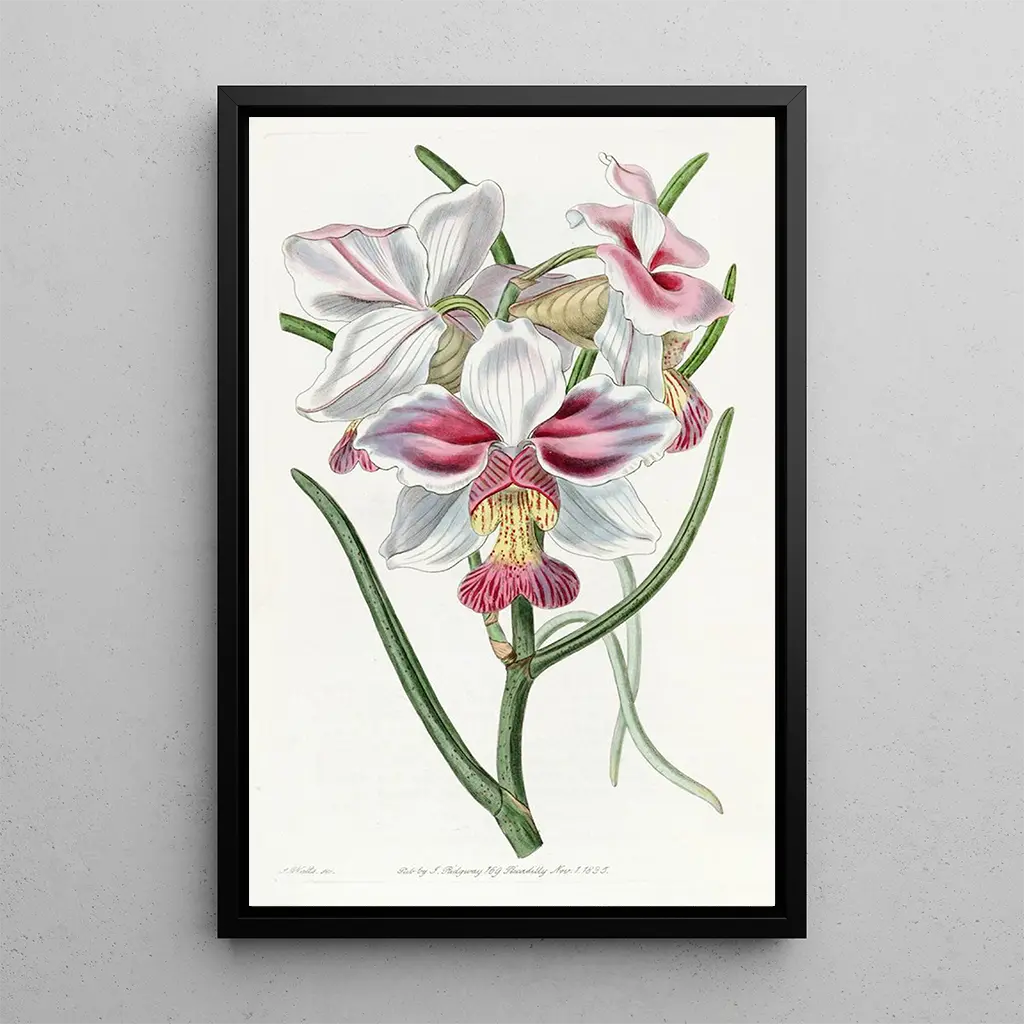 Vanda mit schmalen Blättern, ein faszinierendes werk von Sydenham Edwards, illustriert die majestät der orchideen mit unvergleichlicher Feinheit. Die lebendigen farben und die detaillierten details dieser kunstdrucks wecken eine tropische atmosphäre, in der jedes blatt und jede blume eine geschichte zu erzählen scheint. Die aquarelltechnik, meisterhaft von Edwards beherrscht, ermöglicht es, licht und textur der pflanzen einzufangen und so eine lebendige und dynamische atmosphäre zu schaffen. Dieses werk lädt zur flucht ein und versetzt den betrachter in ferne, exotische länder.
