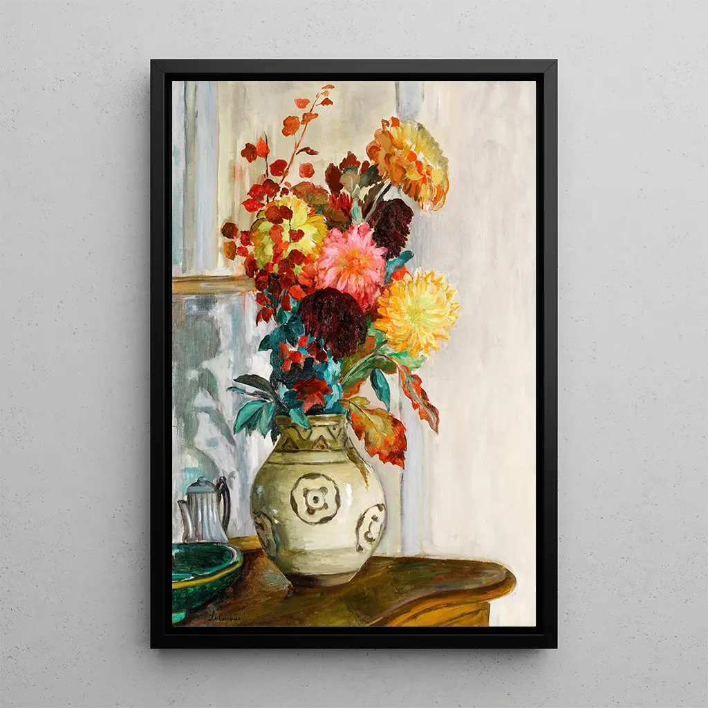In "Vase de chrysanthèmes" bietet Henri Lebasque eine strahlende Blumenkomposition, bei der sich die Chrysanthemen in ihrer ganzen Pracht entfalten. Die lebendigen und vielfältigen Farben der Blumen, die von leuchtendem Gelb bis zu tiefem Rot reichen, harmonieren perfekt mit der Vase und schaffen einen beeindruckenden Kontrast. Die Technik von Lebasque, gekennzeichnet durch dynamische Pinselstriche und mutigen Einsatz von Licht, erweckt dieses Stillleben zum Leben und verwandelt eine einfache Blumenanordnung in ein lebendiges und energiegeladenes Kunstwerk. Die Atmosphäre, die von diesem Gemälde ausgeht, ist sowohl fröhlich als auch ruhig und lädt zur Betrachtung ein.