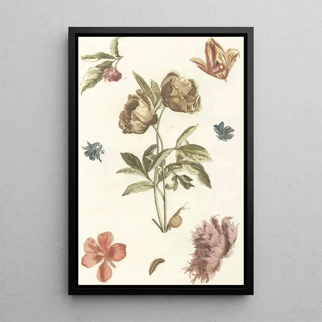 Kunstdruck | Verschiedene Blumen und eine Raupe - Anonym