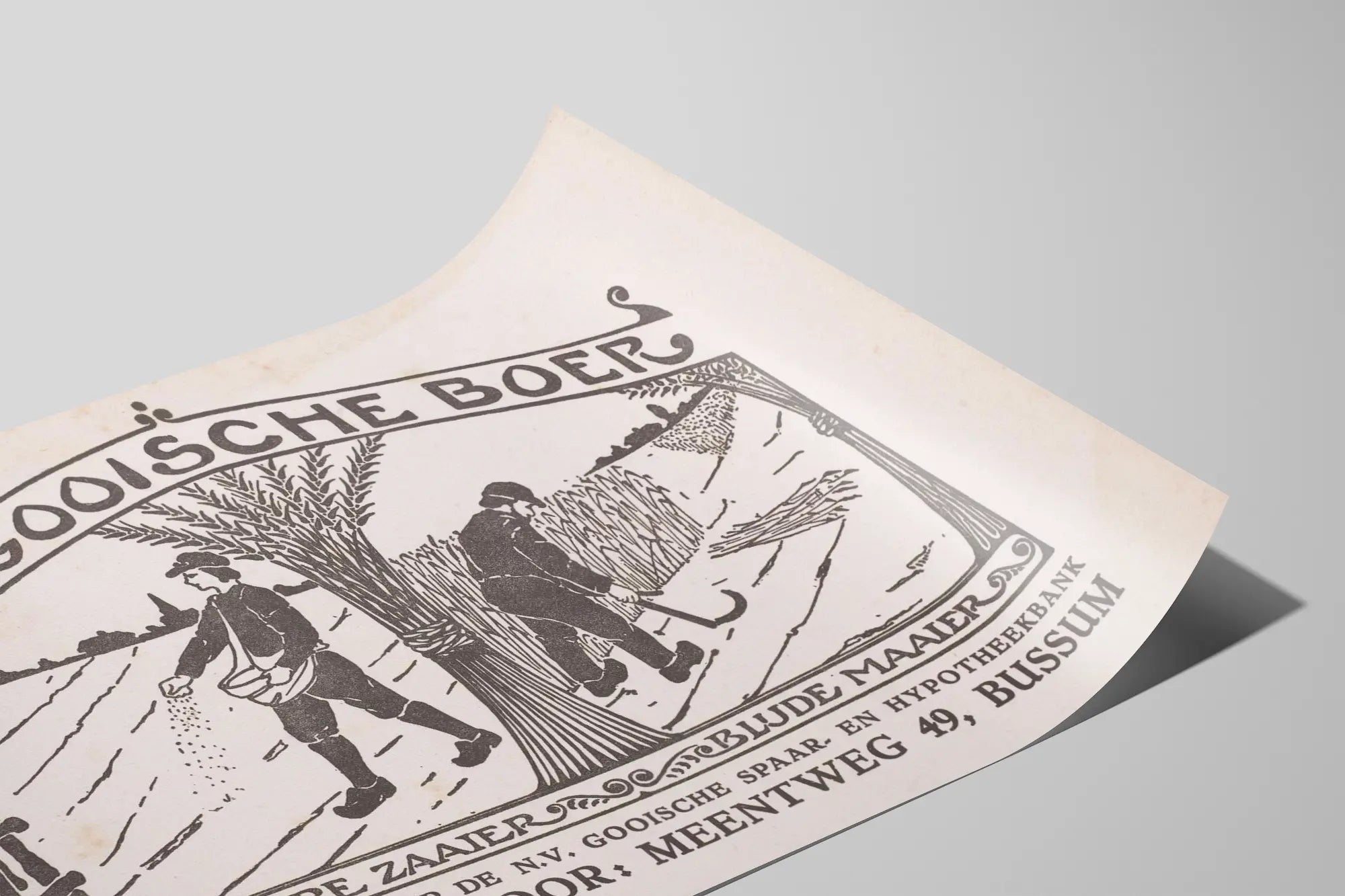 Entdecken Sie dieses Vintage-Poster, das das Landleben durch eine traditionelle Szene von Bauern bei der Arbeit illustriert. Diese Wanddekoration in Schwarz-Weiß hebt zwei ikonische Figuren hervor: einen Säer und einen Erntedank, Symbole der landwirtschaftlichen Zyklen. Der Säer ist dargestellt, wie er Samen in ein sorgfältig gezogener Feld streut, während der Erntedank die Ähren mit einer Sichel erntet. Die Komposition wird von einem stilisierten Baumarkus umrahmt, der von dem Titel „De Gooische Boer“ überragt wird und die authentische und historische Natur dieses Posters betont. Der Kontrast zwischen den schwarzen Silhouetten und dem hellen Hintergrund verleiht sofort einen nostalgischen Charme, ideal für eine ländliche oder rustikale Wanddekoration. Perfekt als Poster, um eine Wand zu schmücken, ruft diese Illustration die Einfachheit und Strenge der traditionellen Landwirtschaft hervor und bringt gleichzeitig einen künstlerischen Akzent in Ihr Zuhause. Das typografische und figurative Poster zeigt auch eine Inschrift am unteren Rand, die Herkunft und Ort angibt, was seine visuelle und kulturelle Identität stärkt. Dieses Poster passt perfekt in Wohnräume wie Wohnzimmer, Küche oder sogar Büro, für eine originelle und bedeutungsvolle Wanddekoration. Entscheiden Sie sich für dieses einzigartige Poster, das die Natur und den Beruf des Landwirts feiert, ideal für Liebhaber traditioneller Kunst und ländlicher Geschichte.