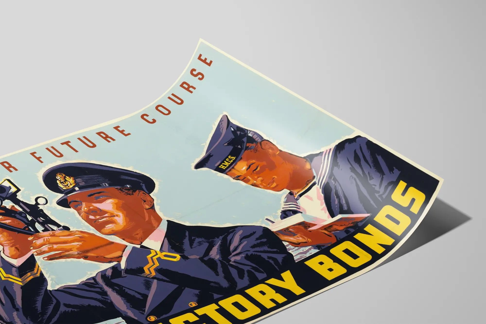 Dieses vintage Wandposter zeigt zwei Mitglieder der Marine in ihrer Uniform: einen Offizier, der ein Sextant zur Navigation benutzt, und einen Matrosen, der in ein Heft blättert. Der helle Hintergrund hebt die Figuren im Vordergrund hervor, die in dunkelblauen Uniformen mit goldenen und weißen Details gekleidet sind; der zweite ist an dem Band "H.M.C.S." auf seiner Mütze erkennbar. Im Hintergrund bewegt sich ein Kriegsschiff auf unruhiger See, was die maritime, strategische Atmosphäre verstärkt. Der Text oben, "PLOT YOUR FUTURE COURSE", lädt dazu ein, die Zukunft zu planen, während am unteren Rand des Posters in gelben Großbuchstaben auf schwarzem Hintergrund der Aufruf "KAUFEN SIE SIEGESSCHEINE" erscheint. Dieses Poster im Retro-Stil mit kontrastreichen Farben, in Orangetönen, Blau und Gelb, vermittelt eine patriotische Botschaft und Unterstützung für die Kriegsanstrengungen, typisch für militärische Propagandaplakate. Als Wanddekoration verleiht dieses Poster jedem Raum – sei es ein Büro, ein Wohnzimmer oder ein Bereich für Marine- oder Militärgeschichte – einen Hauch von Geschichte und Dynamik. Es passt perfekt zu einem Vintage-Industrie- oder Nautikstil und ist ein unverzichtbares Dekorationsobjekt für Liebhaber alter Plakate und militärischer Ikonographie.