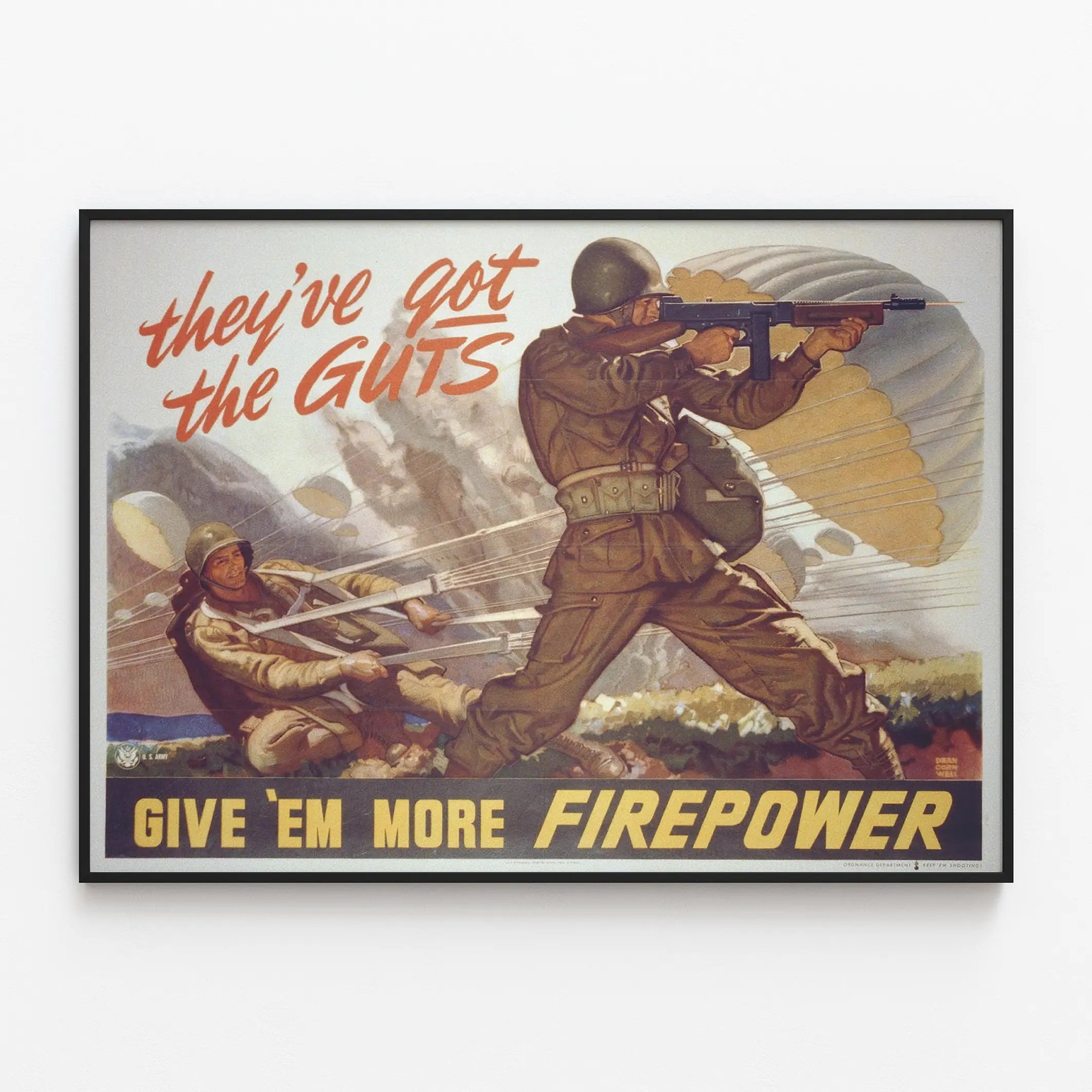 Dieses faszinierende Vintage-Poster zeigt ein kraftvolles militärisches Plakat mit dem Titel „Geben Sie ihnen mehr Feuerkraft“. Es stellt zwei Soldaten in Aktion dar, wobei einer entschlossen mit einer Waffe schießt, während der andere, an einen Fallschirm gebunden, sich auf die Landung vorbereitet. Die in Rot und Gelb geschriebenen Worte betonen den Mut der Soldaten („they've got the guts“) und die Bedeutung, ihre Anstrengungen durch eine erhöhte Feuerkraft zu unterstützen. Dieses Wanddekorationselement passt perfekt in eine Sammlung historischer oder militärischer Poster und verleiht jedem Raum eine Note von Authentizität und Intensität. Dieses Poster ist ideal für alle, die ihren Raum mit einem Werk schmücken möchten, das Mut, Tapferkeit und Engagement vermittelt. Perfekt für ein Büro, einen Freizeitraum oder jeden Ort, der der historischen Erinnerung gewidmet ist, verbindet dieses Druckbild Ästhetik mit bedeutungsvollem Inhalt. Die visuelle Qualität und der grafische Stil erinnern an die Propagandaplakate der militärischen Mitte des 20. Jahrhunderts, gekennzeichnet durch auffällige Farben und eine klare, kraftvolle Botschaft. Dieses Vintage-Wandbild ist eine dekorative Wahl, die Aufmerksamkeit erregt und zum Nachdenken über die Militärgeschichte anregt, während sie eine starke und ausdrucksstarke Atmosphäre schafft. Bringen Sie mit diesem retrospektiven Plakat über den Mut der Soldaten und die strategische Unterstützungskraft eine originelle und charaktervolle Wanddekoration in Ihre Räume.