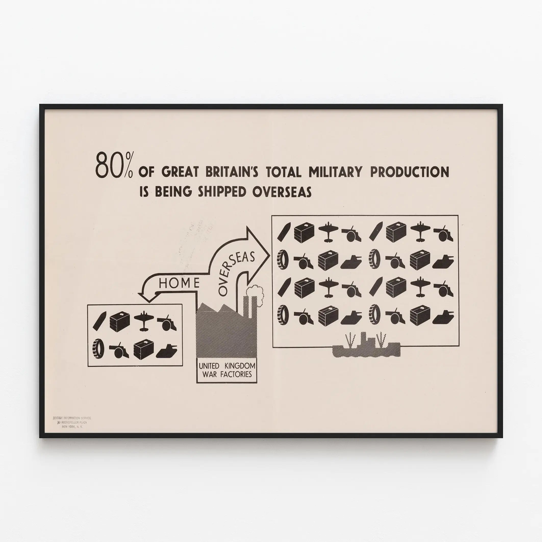 Dieses Vintage-Poster zeigt auf grafische und minimalistische Weise die Statistik, dass 80 % der gesamten Militärproduktion Großbritanniens ins Ausland exportiert werden. Es präsentiert ein schlichtes und elegantes Schema mit Symbolen für Munition, Flugzeuge, Kanonen, Kisten und Panzer, die die Vielfalt des betreffenden Militärmaterials unterstreichen. Auf hellem Hintergrund hebt die Darstellung eine britische Kriegsfabrik hervor, die Quelle dieser Produktion, von der zwei separate Pfeile ausgehen, die den Anteil der im Inland genutzten Produktion („HOME“) und den ins Ausland versandten Anteil („OVERSEAS“) anzeigen. Dieser grafische Stil eignet sich perfekt als informative und ästhetische Wanddekoration. Ob Sie sich für Geschichte, minimalistisches Design oder für ein Vintage-Poster mit markantem Charakter begeistern, dieses Plakat ist eine ideale Wahl, um eine Wand in einem Büro, Wohnzimmer oder Arbeitszimmer zu schmücken. Leicht in verschiedene Einrichtungsstile integrierbar, zieht diese Wanddekoration durch ihre starke Botschaft und ihren Retro-Stil die Aufmerksamkeit auf sich. Diese Art von Poster verleiht Ihrem Zuhause eine Note von Authentizität und Tiefe und spiegelt gleichzeitig einen bedeutenden Moment der britischen Militärgeschichte wider. Das schlichte Format und die klare Gestaltung gewährleisten eine sofortige Lesbarkeit und machen dieses visuelle Bild sowohl dekorativ als auch lehrreich.