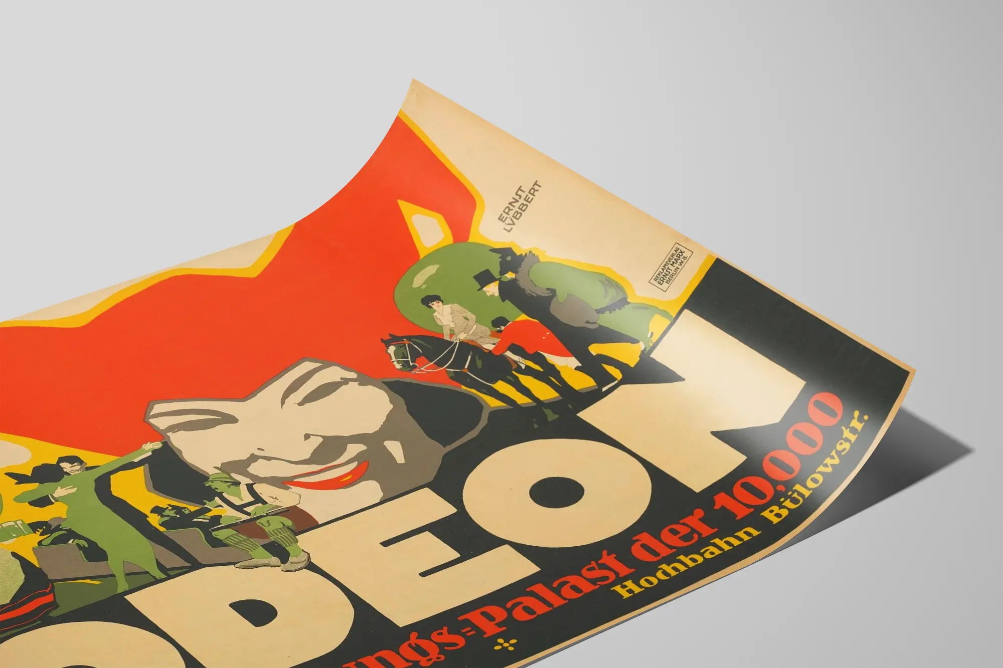 Dieses Vintage-Poster mit dem Titel „Odeon Vergnügungspalast“ ist ein beeindruckendes Element für jede Wanddekoration, inspiriert von der grafischen Kunst vergangener Zeiten. Mit einem charakteristischen künstlerischen Stil, der an die Werbeplakate des frühen zwanzigsten Jahrhunderts erinnert, zeigt dieses Werk eine dynamische Komposition aus menschlichen Figuren, Kostümierten und einem lächelnden Gesicht im Zentrum, umgeben von einem großen, leuchtend roten Hut. Die kräftigen Farben, insbesondere Rot, Schwarz, Gelb und Grün, sowie die mutige Typografie tragen dazu bei, den Blick zu fesseln und eine festliche, lebendige Atmosphäre zu vermitteln.