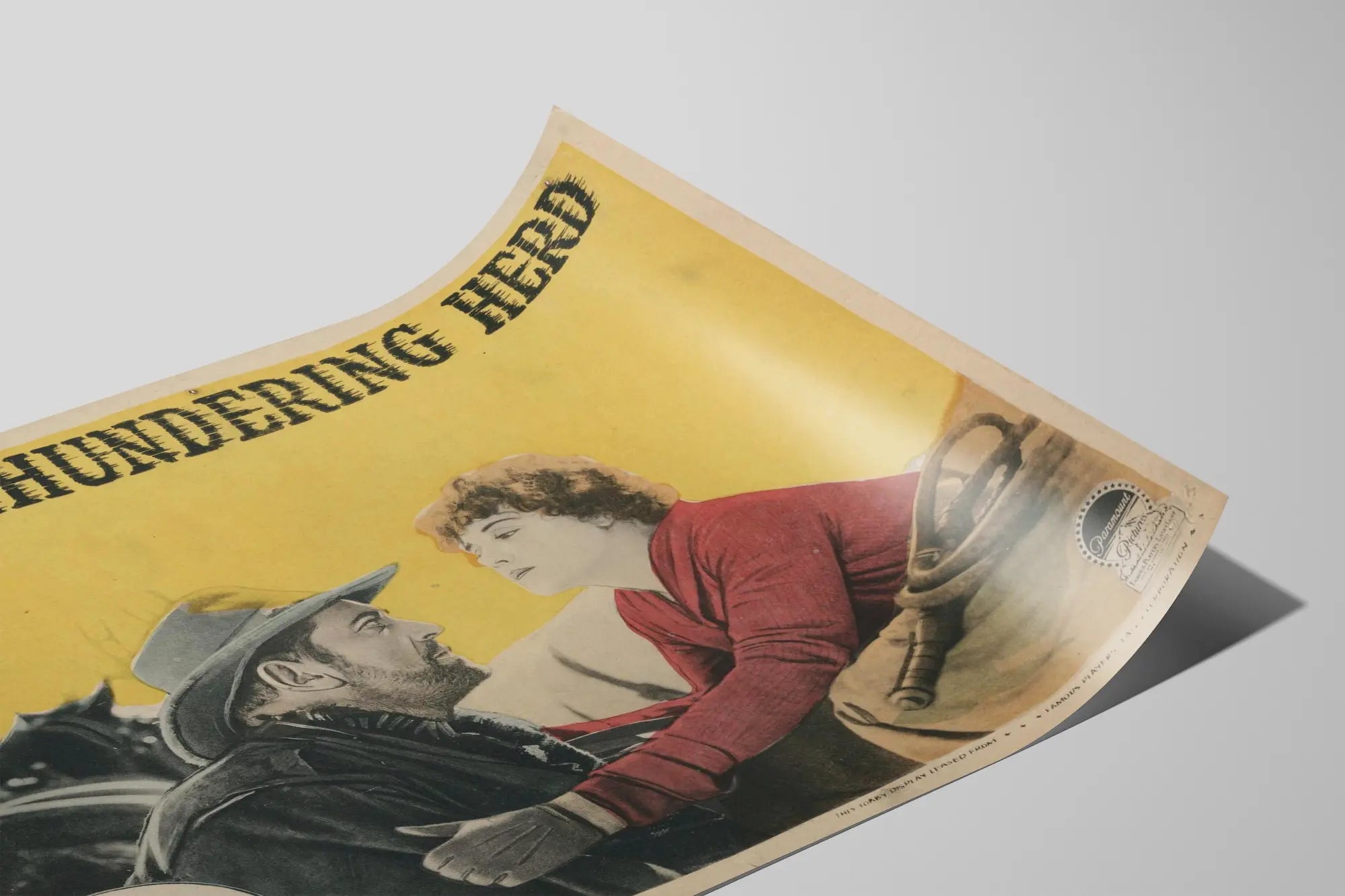 Entdecken Sie dieses ikonische Vintage-Poster mit dem Titel "The Thundering Herd", inspiriert von dem Werk von Zane Grey. Dieses alte Plakat, geprägt von der Aufschrift "A Paramount Picture", vermittelt den Charme des klassischen amerikanischen Kinos. Auf einem leuchtend gelben Hintergrund zeigt dieses Bild einen bärtigen Mann mit Cowboyhut und eine Frau in Rot, die einen Moment emotionaler Intensität festhalten. Die Western-Atmosphäre wird durch die vorhandenen Elemente wie das Pferd im Hintergrund und die Accessoires der Epoche unterstrichen, was eine Wanddekoration mit authentischem und nostalgischem Charakter ergibt. Dieses Bild, ideal für Liebhaber des klassischen Kinos und vintage Dekorationen, bringt eine Prise Nostalgie und Geschichte in Ihr Zuhause. Nutzen Sie dieses Poster als Blickfang in einem Wohnzimmer oder Büro, um eine warme und fesselnde Atmosphäre zu schaffen, die eine Geschichte erzählt. Die stilisierte Typografie am oberen Rand des Posters verleiht eine interessante grafische Dimension und verstärkt die visuelle Anziehungskraft dieser Wanddekoration. Ob Sie ein Fan von Westernfilmen sind oder einfach nur auf der Suche nach einem originellen Plakat, dieses einzigartige Stück ist eine hervorragende Wahl, um Ihre Wände mit einem zeitlosen und eleganten Stil zu bereichern.