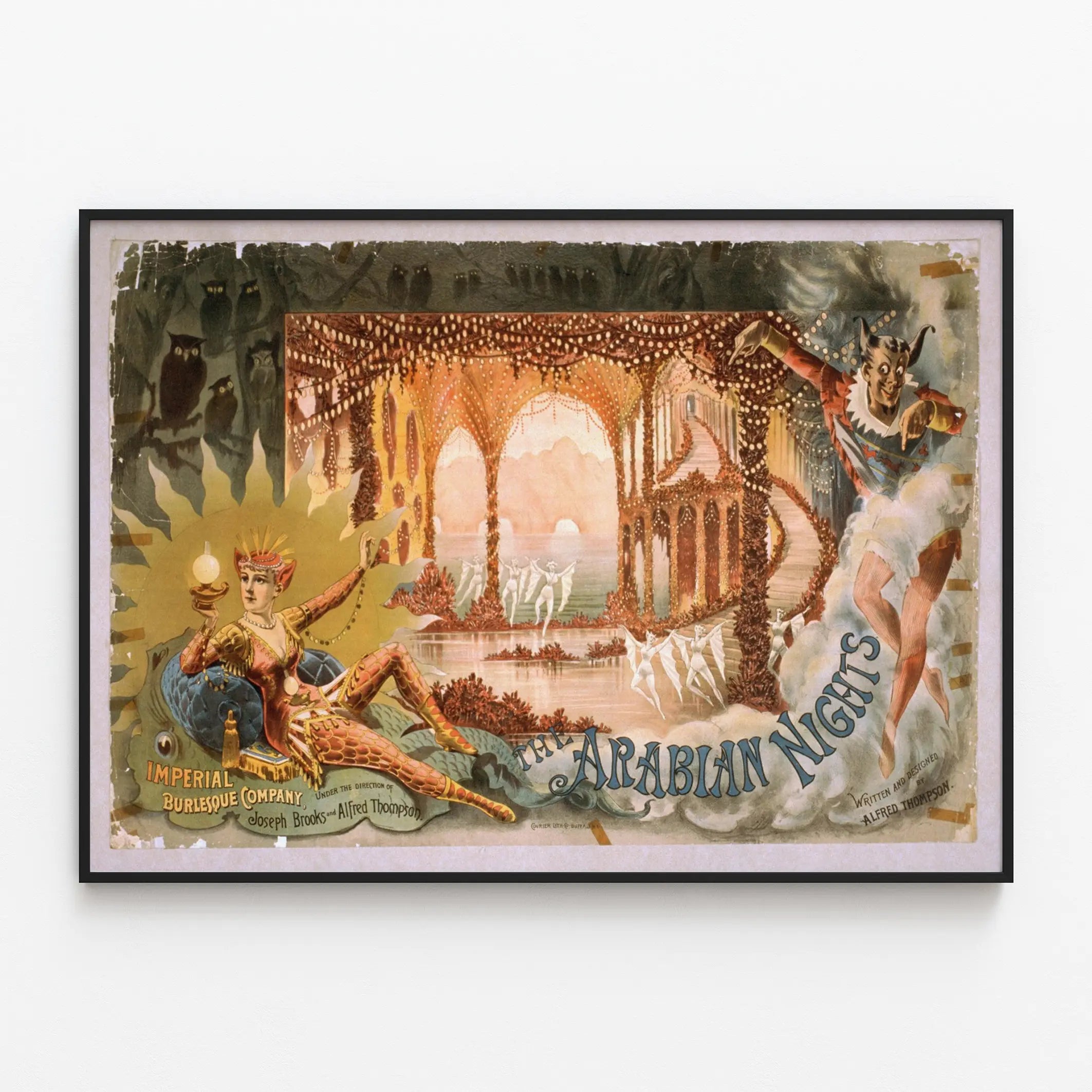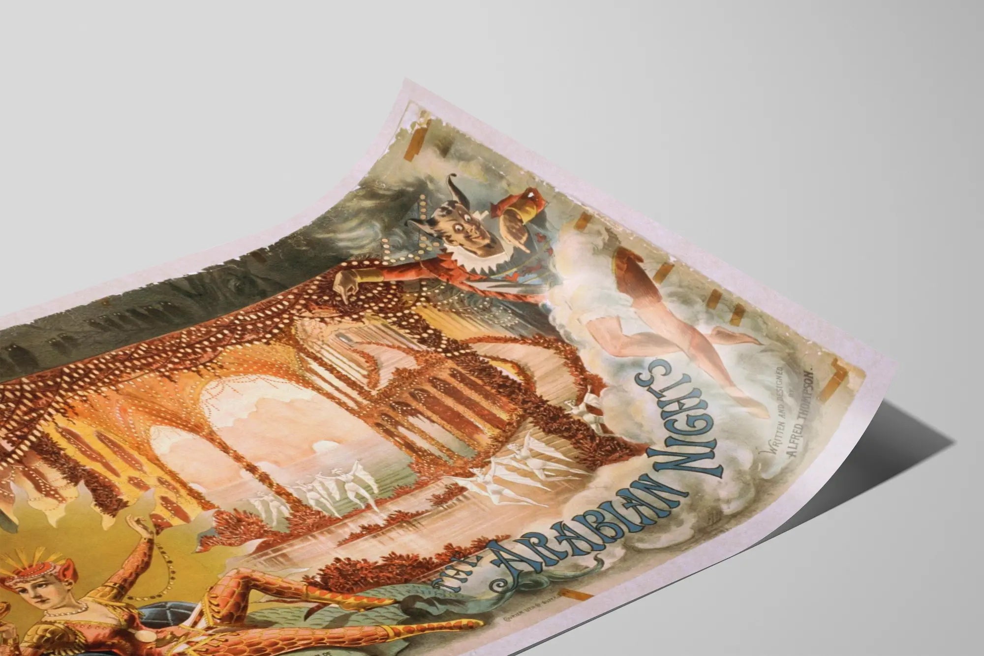 Entdecken Sie dieses Vintage-Poster mit dem Titel Die Arabischen Nächte, ein einzigartiges Stück, das Ihrer Wanddekoration eine Prise Originalität verleiht. Dieses alte Plakat zeigt eine theaterartige Szenerie voller Details, typisch für den klassischen Klamauk, mit einer geheimnisvollen und märchenhaften Atmosphäre. Man sieht mehrere kostümierte Figuren: einen Mann im Teufelskostüm mit ausdrucksvollem Gesicht, eine weibliche Gestalt in bunten, schimmernden Kleidern sowie verschiedene kleine tanzende Silhouetten im Zentrum einer durchbrochenen, erleuchteten Architektur, die an einen märchenhaften Palast erinnert. Dieses Plakat betont warme, braune Töne, vermischt mit Blaunuancen und goldenen Reflexen, was seine theatralische und magische Wirkung verstärkt. Der Hintergrund des Posters ist mit Schatten von Vögeln geschmückt, was eine traumhafte und rätselhafte Atmosphäre schafft, die die Aufmerksamkeit auf sich zieht. Das gesamte Bild ist von Gebrauchsspuren und Alterungseffekten umrahmt, die den Vintage-Charme dieses Stücks unterstreichen – ideal für Liebhaber retro Dekorationen oder um eine Leseecke oder ein Wohnzimmer im einzigartigen Stil zu gestalten. Dieses Wanddekoration-Poster passt perfekt in eine Sammlung alter Plakate oder in ein Interieur, das von einer bohèmehaften und exotischen Stimmung geprägt ist. Mit seinen kunstvoll gestalteten grafischen Elementen und seinem retro-künstlerischen Stil wird es diejenigen begeistern, die sowohl Ästhetik als auch Geschichte in ihren Dekorationsaccessoires suchen. Sein Panoramaformat ermöglicht eine wirkungsvolle Präsentation in einem Querformat, über einem Sofa, einem Schreibtisch oder in einer Bibliothek. Bringen Sie mit diesem Wandbild ein Stück Mystik und Eleganz an Ihre Wände, indem Sie die zauberhafte Welt der Tausendundeinen Nächte neu entdecken – ein zeitloses Inspirationsmotiv, das durch seine Exotik und faszinierenden Geschichten begeistert. Dieses dekorative Werk wird ein zentrales Stimmungselement in Ihrem Zuhause sein, das zum Träumen und Entfliehen einlädt.
