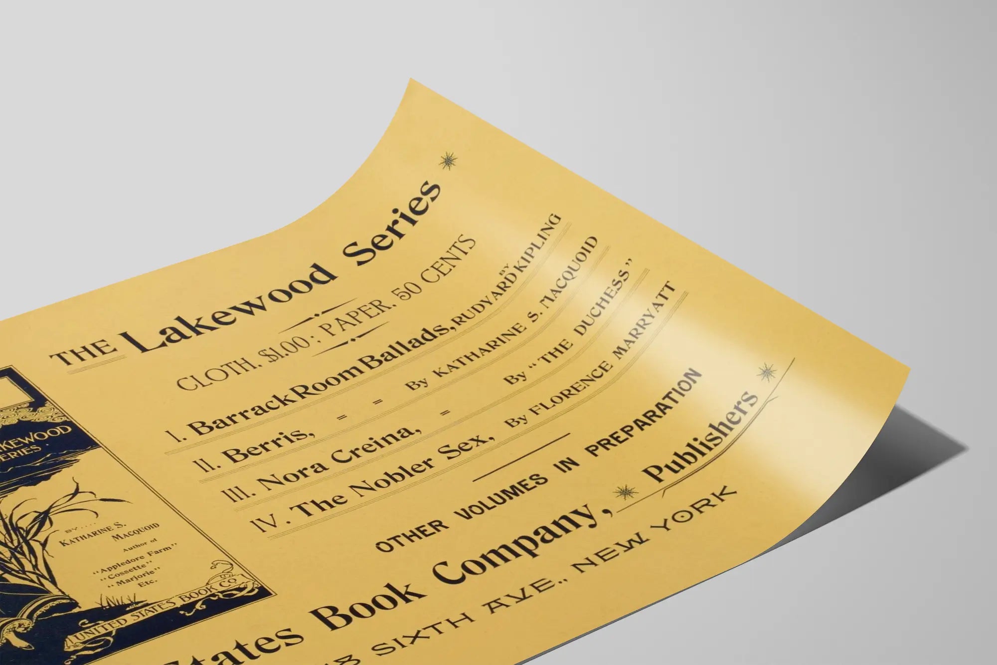 Entdecken Sie dieses Vintage-Poster mit dem Titel „The Lakewood Series“, ein einzigartiges Stück, das sich perfekt für eine elegante und nostalgische Wanddekoration eignet. Dieses Werbeplakat zeigt eine Reihe alter Bücher, mit einem kunstvollen Jugendstil-Design, geprägt von einer stilisierten Illustration in Blau und Beige. Die dargestellte Szene zeigt eine Frau, die ruhig am Ufer eines Sees liest, umgeben von Schilf, und eine poetische sowie nostalgische Atmosphäre vermittelt. Dieser Poster-Typ ergänzt eine Innendekoration, die alten Charme mit Raffinesse verbindet, ideal für eine stilvolle Wandgestaltung. Dieses Poster bietet ein harmonisches Gleichgewicht zwischen Text und Bild, mit einer klassischen Typografie, die die Titel der Werke der Lakewood Series hervorhebt: „Barrack Room Ballads“ von Rudyard Kipling, „Berris“ von Katharine S. Macquoid, „Nora Creina“ signiert „The Duchess“ und „The Nobler Sex“ von Florence Marryatt. Eine schöne Einladung zur alten Literatur und Kultur, die mit feinem Werbecharme der Epoche gestaltet ist. Sein Format und seine Maße machen es zu einer leicht integrierbaren Wanddekoration in verschiedenen Räumen: Wohnzimmer, Büro, Bibliothek oder Leseecke. Ob in einem modernen oder eher traditionellen Rahmen präsentiert, wird dieses Vintage-Poster Ihrem Zuhause einen künstlerischen und nostalgischen Akzent verleihen. Es ist perfekt für Liebhaber klassischer Poster, literarischer Plakate oder Wanddekorationen im Retro-Stil. Hergestellt für Langlebigkeit, vermittelt diese Wanddekoration ein Gefühl von Authentizität und Eleganz, indem sie die Harmonie zwischen Bild und Text betont. Entscheiden Sie sich für dieses originelle Poster „The Lakewood Series“, um Ihre Sammlung an Vintage-Postern zu bereichern und Ihren Wänden Charakter zu verleihen. Eine ideale Wahl, um mit Charme und Subtilität zu dekorieren und gleichzeitig die grafische Kunst der Epoche zu feiern.