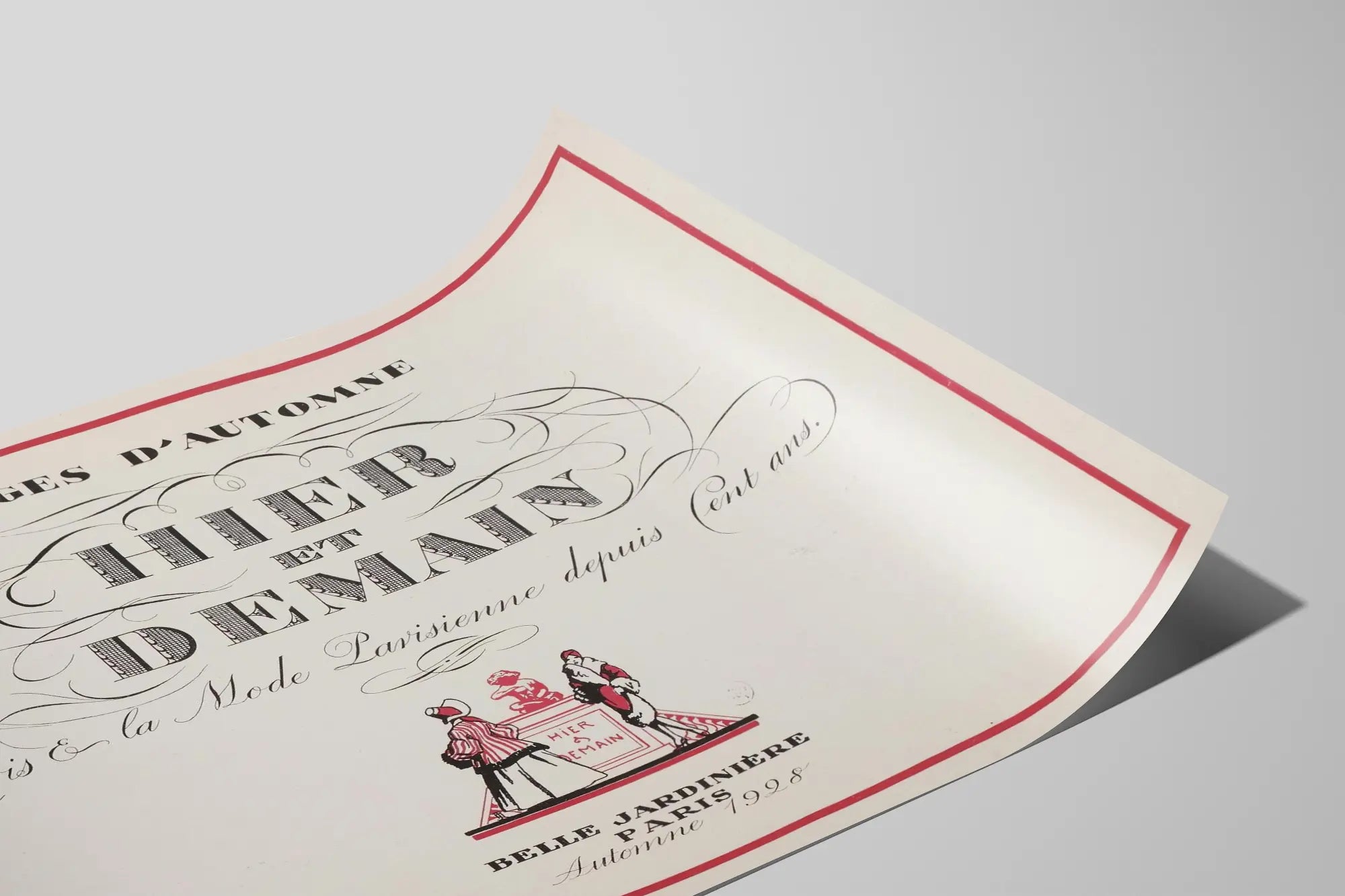 Bringen Sie einen Hauch von Retro-Eleganz in Ihre Wanddekoration mit diesem Vintage-Poster mit dem Titel „Herbstseiten“. Das Bild zeigt den Geist und die Mode Paris’ seit einem Jahrhundert und vermittelt einen klassischen, zeitlosen Charme, ideal für Liebhaber von Modegeschichte und Inneneinrichtung. Der sorgfältig kalligraphierte Text, die zarten ornamentalen Muster und der subtile Farbkontrast zwischen Rot und Schwarz unterstreichen einen äußerst raffinierten Vintage-Stil. Diese Wanddekoration, inspiriert von der Pariser Mode im Herbst 1928, fügt sich perfekt in ein klassisches, bohemisches oder industrielles Interieur ein und verleiht eine authentische, kulturelle Atmosphäre. Der schlichte rote Rahmen umschließt das Motiv schön und betont den alten Charakter sowie den künstlerischen Stil dieses Posters. Das zentrale Motiv zeigt zwei Figuren in zeitgenössischer Kleidung vor einer Skulptur und symbolisiert die Verbindung zwischen „Gestern und Morgen“. Dieses Poster ist eine schöne Idee, um Ihre Wände im Wohnzimmer, Büro oder Schlafzimmer aufzuwerten und eine Prise Pariser Nostalgie in Ihre Dekoration zu bringen. Für Liebhaber der Wandgestaltung ist dieses grafisch-typografische Vintage-Bild ein Blickfang, der Ihre Sammlung von Postern bereichert. Dank seiner Maße und seiner sorgfältigen Gestaltung besticht dieses Bild durch Eleganz und künstlerisches Flair – perfekt, um eine historische und kulturelle Atmosphäre in Ihren Wohnräumen zu schaffen. Dieses Produkt ist auch ein ideales Geschenk für Mode-, Geschichts- und Grafikkunstliebhaber, die nach einer Wanddekoration mit authentischem Stil und bedeutungsvoller Aussage suchen.