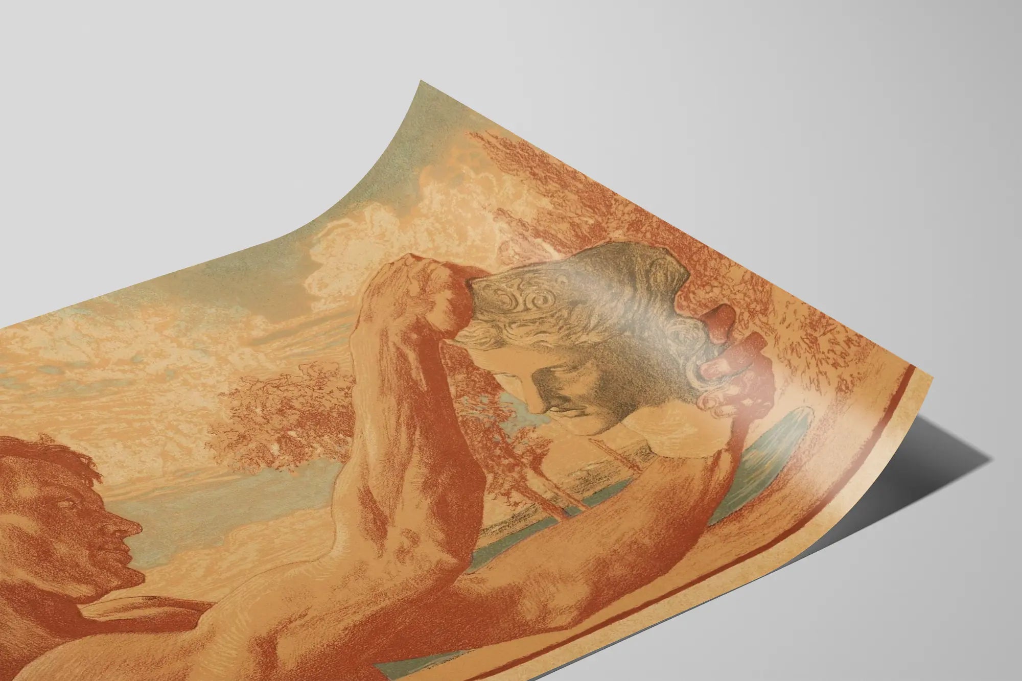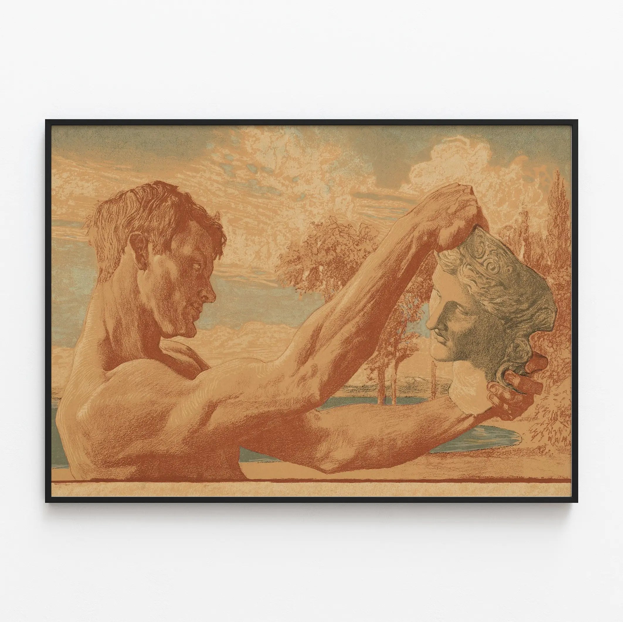 Dieses Vintage-Poster zeigt eine klassische Illustration, die einen muskulösen Mann darstellt, der eine antik anmutende Skulptur hält. Die künstlerische Komposition ehrt tief die klassische Bildhauerkunst, bei der menschliche Kraft und die Feinheit des Marmorporträts um die Aufmerksamkeit konkurrieren. Die warmen Farbtöne, geprägt von Brauntönen, Beigetönen und subtilen Blautönen, verleihen dieser Wanddekoration eine Atmosphäre, die sowohl nostalgisch als auch zeitlos wirkt. Der grafische Stil erinnert an alte Gravuren oder Lithografien und unterstreicht den authentischen Charme dieses Posters, das sich perfekt in ein klassisches oder vintage-inspiriertes Interieur einfügt. Dieses Kunstposter richtet sich an Liebhaber der Kunstgeschichte, der Bildhauerei oder des klassischen Designs, die ihre Wände mit einem Hauch von Kultur und Eleganz verschönern möchten. Ob gerahmt oder ungerahmt, dieses Wandmotiv bereichert jeden Raum mit einem Hauch von Raffinesse und künstlerischer Kontemplation. Diese Wanddekoration lädt dazu ein, über die Harmonie zwischen menschlicher Form und skulpturalem Werk nachzudenken, und symbolisiert die kulturelle Weitergabe durch die Zeitalter. Eine perfekte Wahl für eine lernreiche Atmosphäre, ein Wohnzimmer oder ein Büro im klassischen Stil, das die Schönheit der Formen und den Reichtum des künstlerischen Erbes betont.