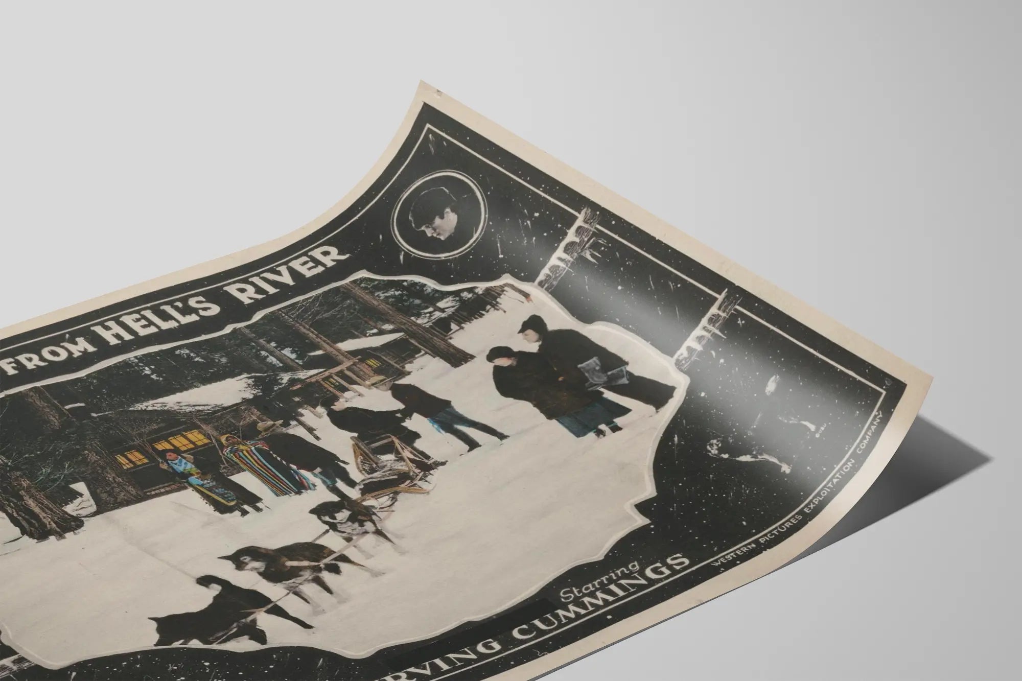Entdecken Sie dieses Vintage-Poster mit dem Titel „Mann vom Fluss der Hölle“, ein echtes Wanddekorationselement, inspiriert vom klassischen Kino. Dieses Poster zeigt eine verschneite Szene, in der mehrere Figuren um einen Hundeschlitten versammelt sind, eingebettet in eine Waldlandschaft mit Holzhütten. Oben sind zwei kreisförmige Rahmen, die jeweils das Porträt einer Figur zeigen und so die dramatische und historische Atmosphäre dieser Illustration verstärken. Der Titel „Mann vom Fluss der Hölle“ ist gut sichtbar oben auf dem Poster angebracht, begleitet vom Namen Irving Cummings, was diesem Plakat einen authentischen und nostalgischen Charme verleiht. Perfekt für Liebhaber von Retro-Wanddekorationen fügt sich dieses Poster mühelos in ein Wohnzimmer, Büro oder Heimkino ein und verleiht dem Raum eine elegante und geschichtsträchtige Note. Die feinen Details, wie die Hunde im Vordergrund und die warm gekleideten Silhouetten, deuten auf eine winterliche Stimmung und eine dramatische Atmosphäre hin. Dieses Wandbild ist eine ideale Wahl für alle, die ihre Wände mit einem einzigartigen, geschichtsträchtigen Objekt schmücken möchten, das die Welt des alten Kinos mit Vintage-Charme verbindet. Ob für eine persönliche Sammlung oder eine thematische Inneneinrichtung – das Poster „Mann vom Fluss der Hölle“ wird den Blick fesseln und Ihren Raum mit einer markanten Persönlichkeit und einem Hauch von Authentizität bereichern.