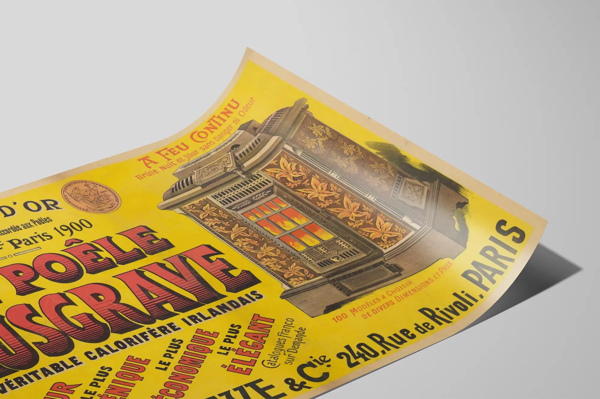 Dieses vintage Werbeplakat hebt den Musgrave-Ofen hervor, einen irischen Heizkörper, der für seine außergewöhnlichen Qualitäten bekannt ist. Für die Wanddekoration gedacht, verleiht dieses Plakat jedem Raum eine Note von Authentizität und Retro-Charm. Gedruckt im alten grafischen Stil zeigt es den Ofen im Detail, mit eleganten Blumenmustern und sichtbarem Feuer, das Wärme und Behaglichkeit symbolisiert. Der Text hebt die Vorzüge dieses Ofens hervor: Er wird als der beste, hygienischste, wirtschaftlichste und eleganteste beschrieben, allesamt ausgezeichnet mit einer Goldmedaille auf der Weltausstellung in Paris im Jahr 1900. Dieses Plakat lässt sich sowohl im Wohnzimmer, in der Küche als auch in einem Raum für Vintage-Dekoration integrieren. Es richtet sich an Liebhaber antiker Gegenstände und an Dekorationsenthusiasten, die nach einem einzigartigen Poster suchen, das Charakter und Geschichte ausstrahlt. Durch seine lebendigen Farben und den bemerkenswerten Typografiestil dient es auch als dekorativer Blickfang in einem Raum. Zusammenfassend bietet diese vintage Wanddekoration einen historischen Blick auf ein traditionelles Haushaltsgerät und hebt zugleich ein künstlerisches Design sowie eine Werbebotschaft aus der Epoche hervor – perfekt für Sammler und Liebhaber authentischer Dekoration.