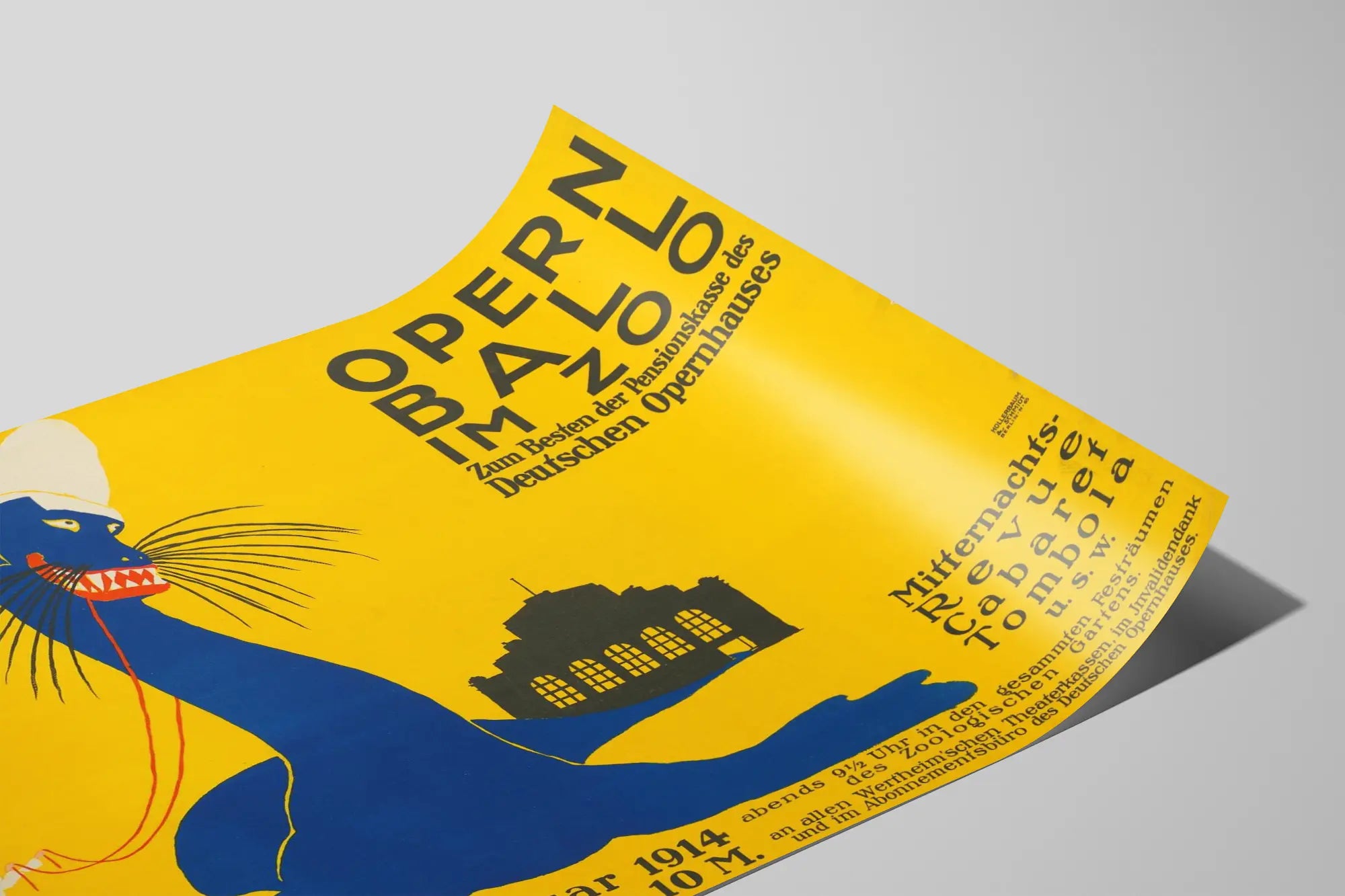Dieses Plakat im künstlerischen und typografischen Stil der Epoche erinnert an eine kulturelle Veranstaltung — einen Opernball im Zoo — der am 26. Januar 1914 in Berlin stattfand, wie der deutsche Text angibt. Die Retro-Ästhetik, die schlichten Formen und die Verwendung von Primärfarben machen dieses Poster zu einem perfekten Stück für Liebhaber grafischer Kunst des frühen 20. Jahrhunderts.