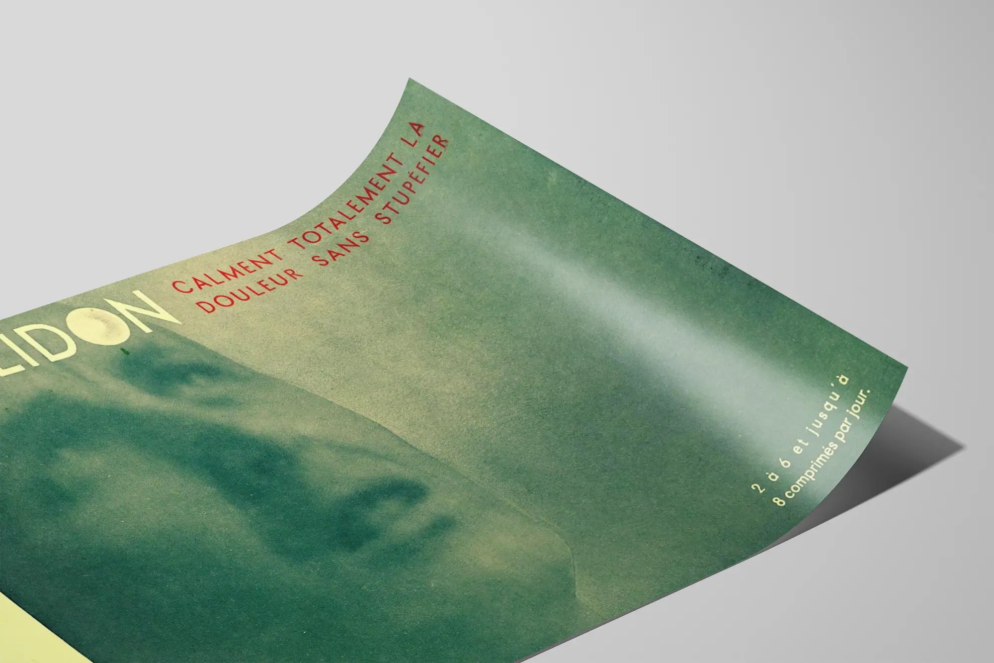 Dieses Vintage-Poster Optalidon ist ein echtes Klassiker der Wanddekoration, inspiriert von alter pharmazeutischer Werbung. Es zeigt ein schlichtes und kontrastreiches Design, das eine minimalistische grafische Komposition mit einem grünen Farbton eines ausdrucksstarken menschlichen Gesichts kombiniert, das Schmerz und dessen Linderung evoziert. Der rote Schriftzug lenkt die Aufmerksamkeit auf den Slogan „Lindert den Schmerz vollständig, ohne zu betäuben“, und hebt die angeblichen Vorteile des präsentierten Produkts hervor. Die gewählte Typografie ist typisch für Werbeplakate vergangener Jahre, mit einer Mischung aus weißen und roten Großbuchstaben, die das visuelle Gesamtbild lebendig machen. Der seitliche gelbe Rahmen mit der roten Zahl „2“ und dem Sandoz-Logo verleiht diesem Plakat eine authentische Note, die sich harmonisch in ein Retro- oder Industrie-Interieur einfügen lässt. Perfekt für Liebhaber origineller Wanddekoration, kann dieses Poster auch in einem Vintage-Rahmen präsentiert oder als dekoratives Plakat verwendet werden, um einem Büro, einem Warteraum oder einem Wohnzimmer eine Note von Geschichte und Eleganz zu verleihen. Sein schlichter und klarer grafischer Stil macht es geeignet für verschiedenste Umgebungen und schafft eine Atmosphäre, die sowohl professionell als auch künstlerisch wirkt. Ob Sie sich für die visuelle Kommunikation vergangener Zeiten begeistern oder einfach ein einzigartiges, bedeutungsvolles Dekorationselement suchen – dieses Optalidon-Poster ist eine ideale Wahl. Es zeugt von der Kunst der Werbung und Typografie des 20. Jahrhunderts und präsentiert ein pharmazeutisches Produkt auf ästhetische und wirkungsvolle Weise. Entscheiden Sie sich für dieses Wandbild, um Ihre Wände mit einem Stück voller Charakter und Geschichte zu beleben, das Blicke auf sich zieht und Neugier weckt.