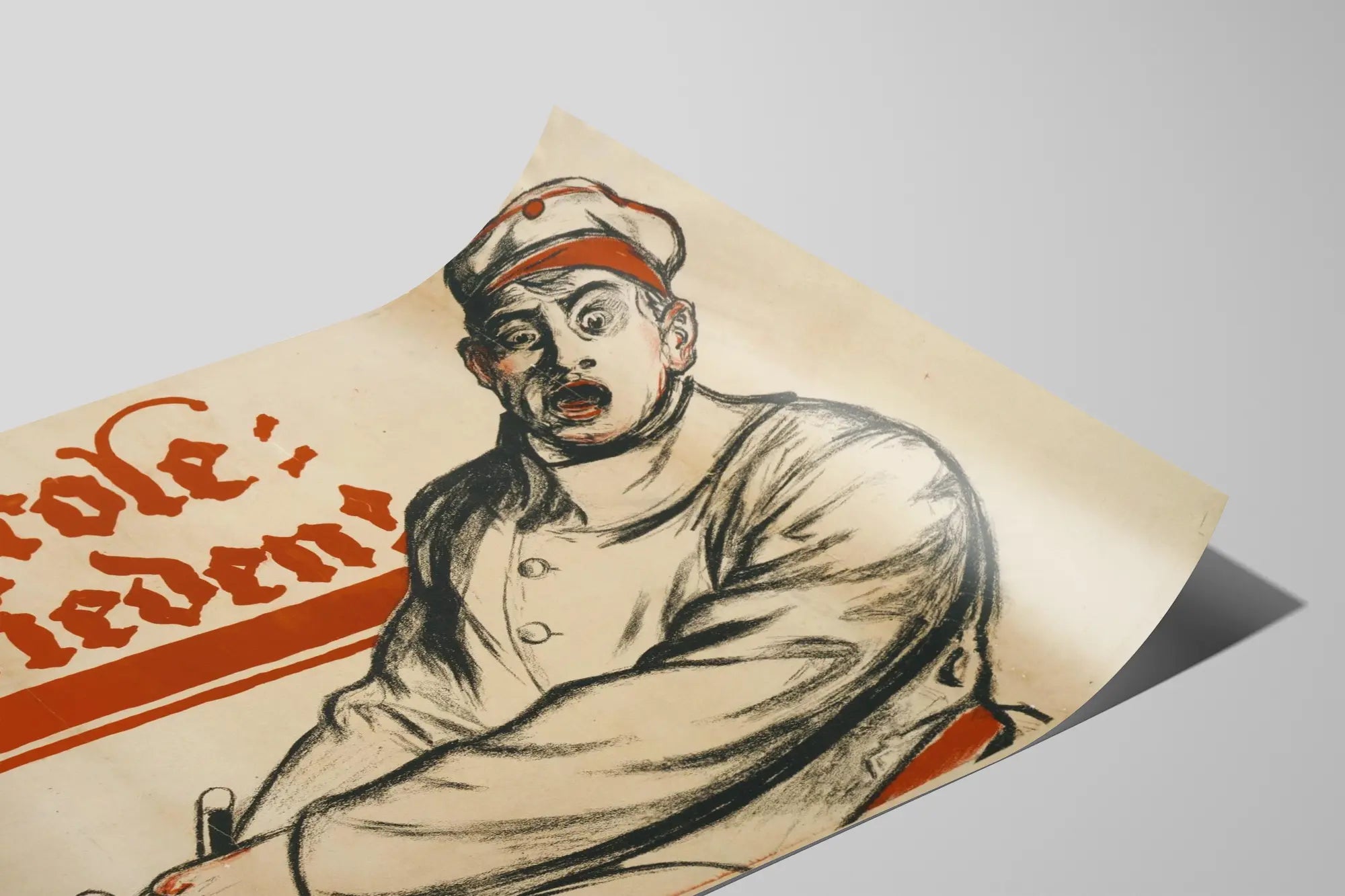Entdecken Sie dieses vintage Plakat im eindrucksvollen expressionistischen Stil, das eine Figur mit ausdrucksvollem Gesicht zeigt, gekleidet in eine helle Uniform und eine Mütze. Dieses Poster ruft eine starke Emotion hervor, mit dem Ausruf „Parole: Frieden!“ in roten gotischen Buchstaben, der die Botschaft des Friedens oder eines dringenden Appells unterstreicht. Die Komposition basiert auf einem deutlichen Kontrast zwischen Schwarz und Ocker, um die Züge der Figur hervorzuheben, deren Haltung den Betrachter überrascht und anspricht. Diese Wanddekoration, geprägt durch ihren grafischen Stil und die intensive Atmosphäre, präsentiert sich als originelles und bedeutungsvolles Dekorationselement, ideal für ein Retro- oder Protestambiente. Perfekt für Liebhaber dramatischer Plakate, eignet sich dieses Stück ebenso gut zur Hervorhebung in einem Wohnzimmer, einer Bibliothek oder einem Arbeitsbereich, in dem die Kraft der visuellen Botschaft gewünscht wird. Dieses Vintage Plakat verleiht einen Hauch Geschichte und eine einzigartige Ästhetik, die expressive Illustration und markante Typografie verbindet und ein engagiertes künstlerisches Erbe widerspiegelt. Eine Wanddekoration, die durch ihre visuelle Wirkung und authentische Erscheinung hervorsticht.