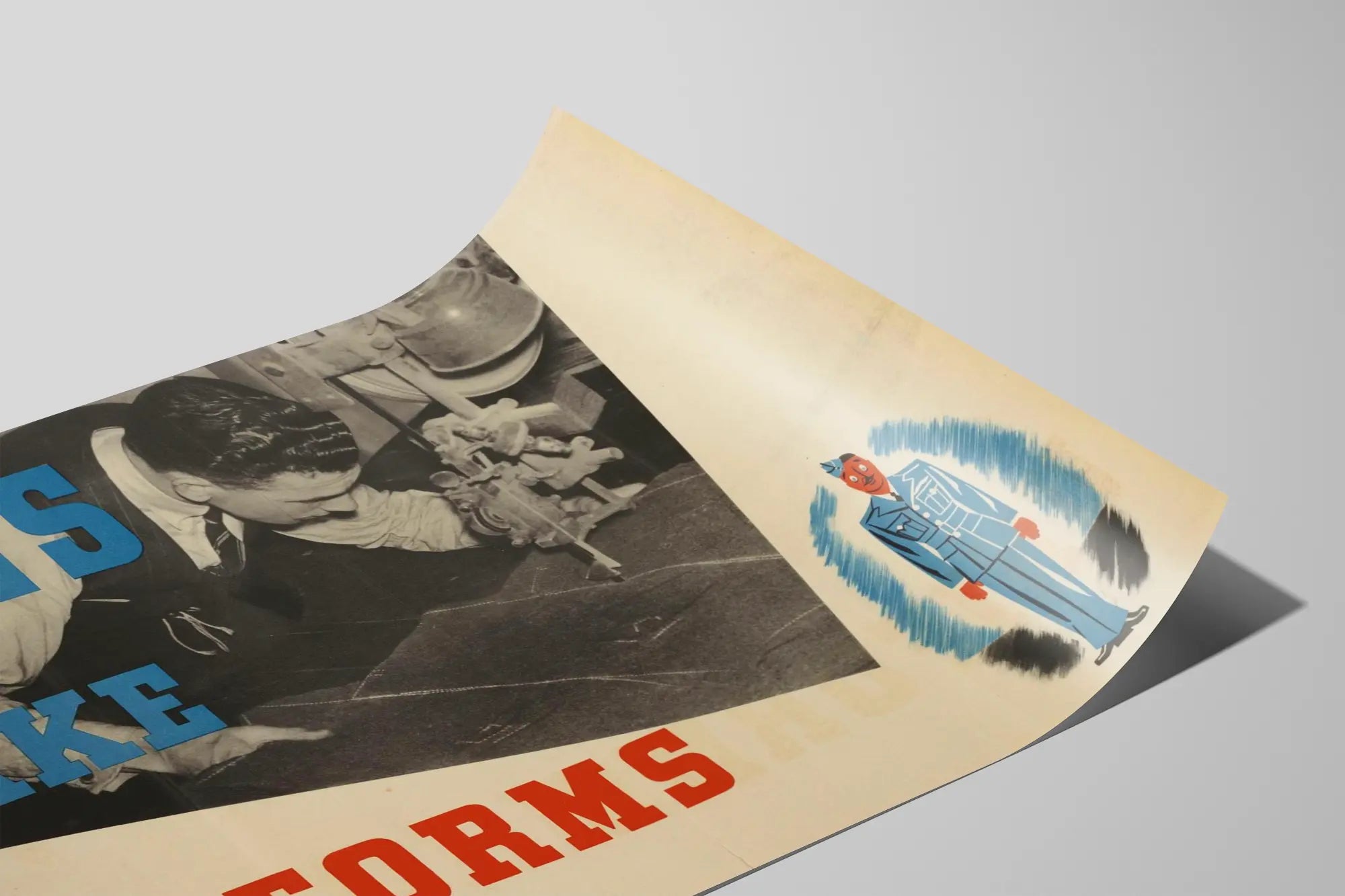 Dieses Vintage-Poster mit dem Titel „Rags Make Uniforms“ ist eine originelle Wahl, um Ihrer Wanddekoration einen industriellen und retro-inspirierten Akzent zu verleihen. Es zeigt eine Schwarz-Weiß-Fotografie eines konzentrierten Arbeiters an einer industriellen Nähmaschine, der textile Stücke fertigt. Die Worte „RAGS“ und „MAKE“ sind in großen blauen Buchstaben gedruckt, während „UNIFORMS“ in leuchtendem Rot erscheint und so die visuelle Wirkung dieses Posters verstärkt. Auf der rechten Seite zeigt eine stilisierte farbige Illustration eine Figur in einer blauen Militäruniform, die das Ergebnis der Arbeit des Schneiders symbolisiert. Diese grafische Komposition verbindet Fotografie und Illustration und schafft einen Kontrast zwischen traditioneller Handwerkskunst und dem symbolischen Bild der fertigen Uniform.