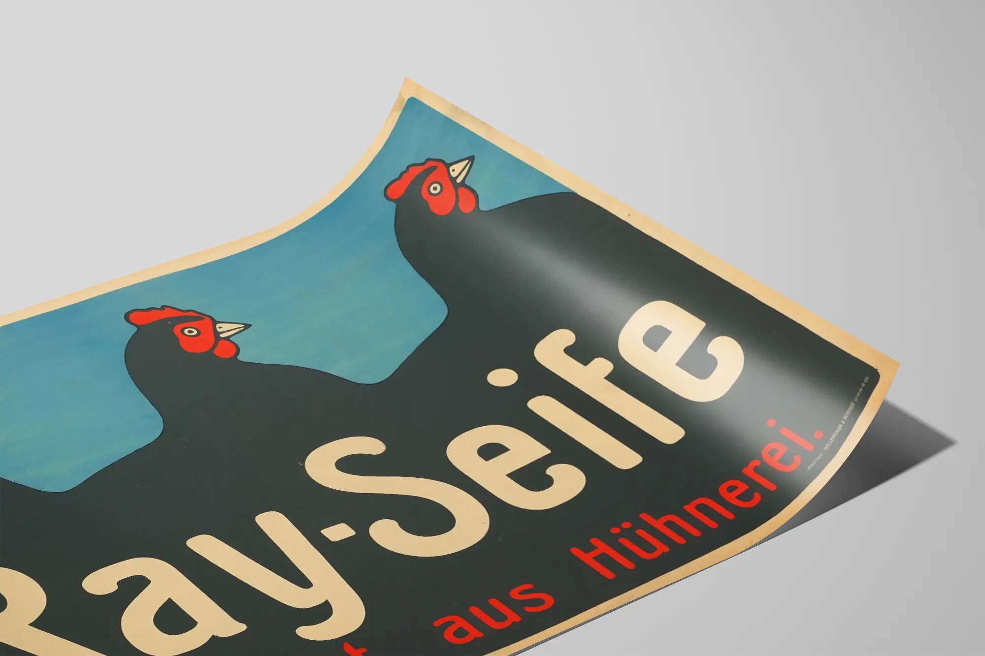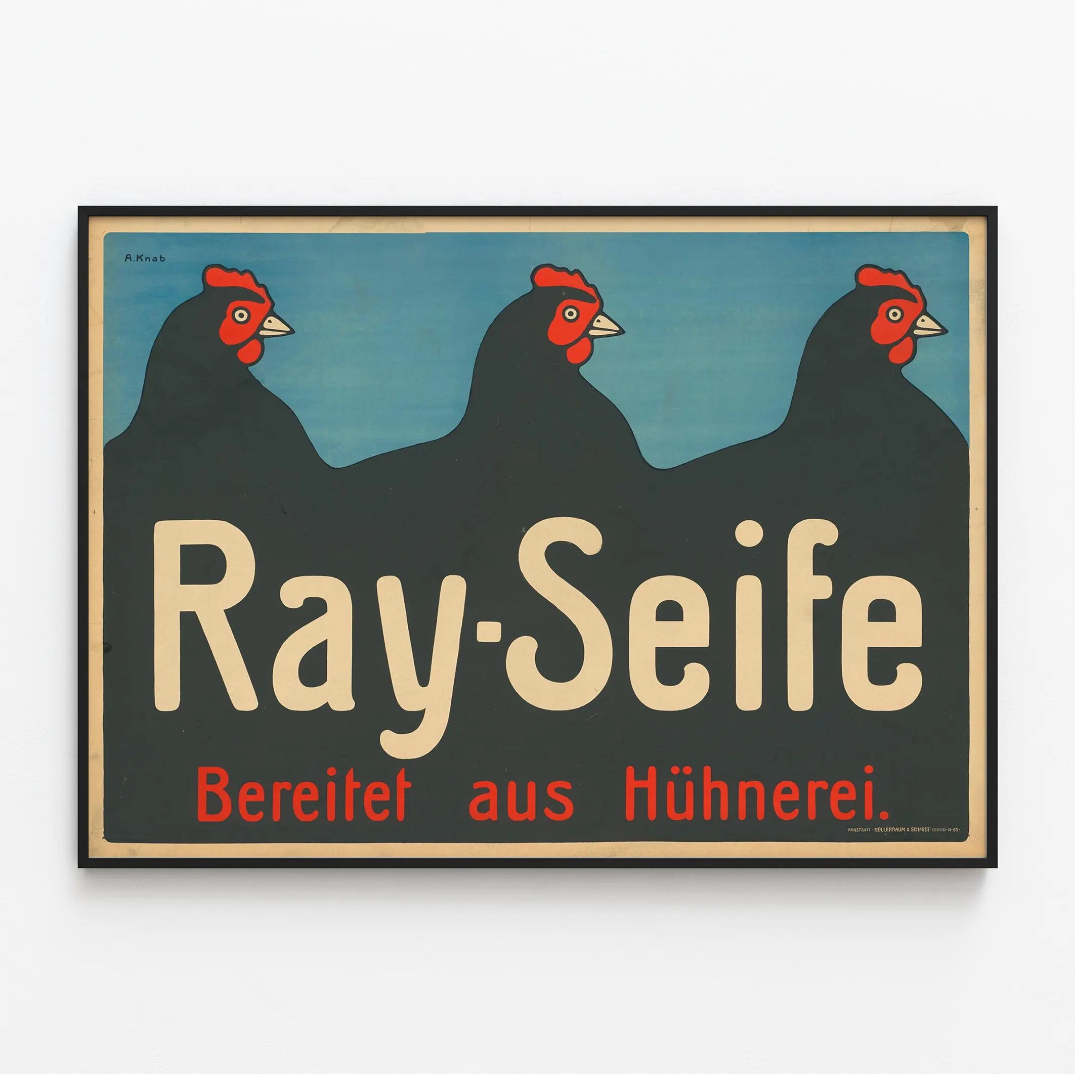 Vintage-Poster Ray Seife mit schwarzen Hühnern auf blauem Hintergrund