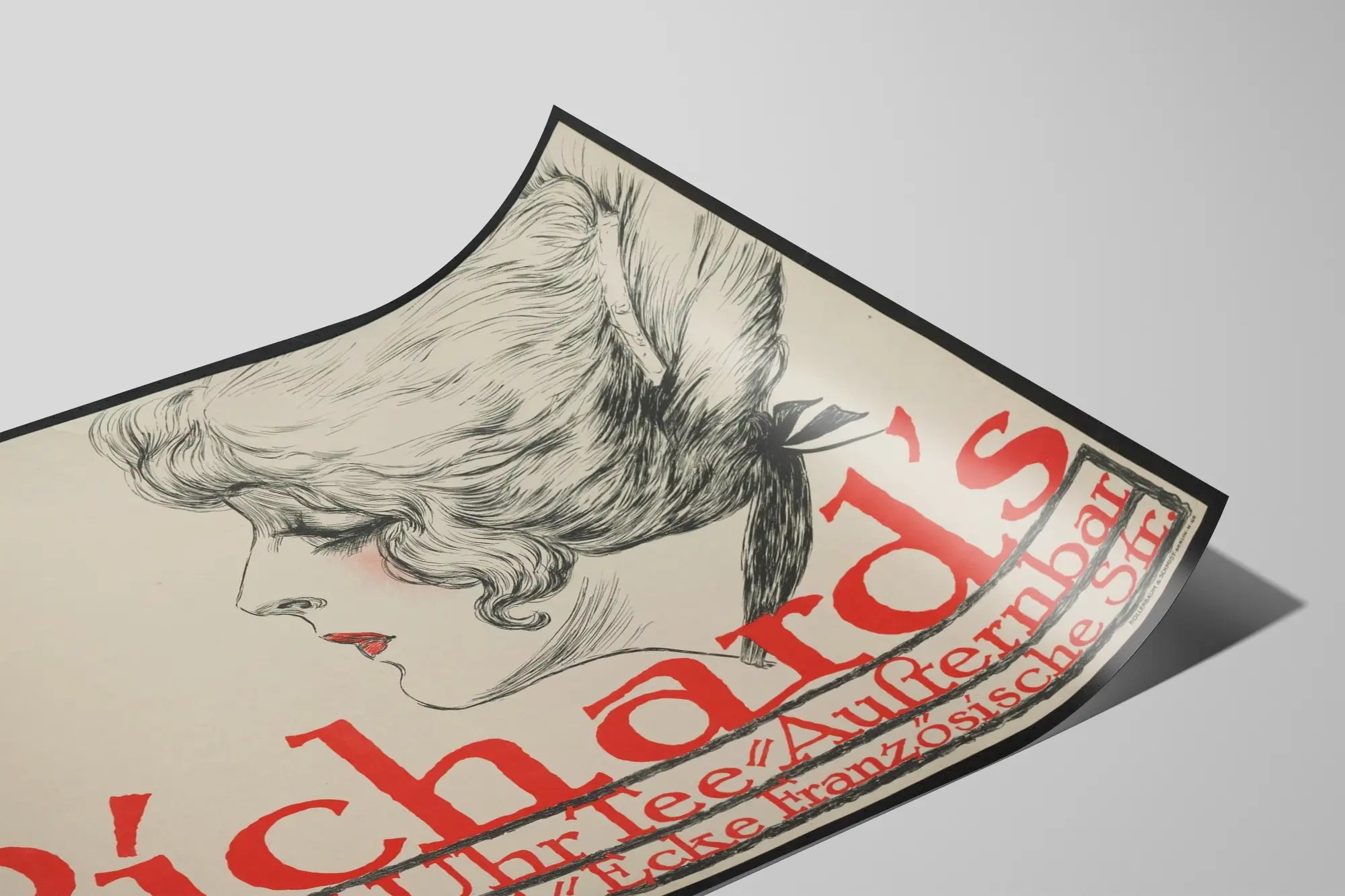 Dieses Vintage-Poster zeigt eine elegante und detaillierte Illustration eines fein gezeichneten Frauenprofils. Das Gesicht der Frau ist seitlich dargestellt, mit präzisen Zügen und einem grafischen Stil, der durch feine Linien geprägt ist und Volumen in ihre lockigen Haare verleiht, die hinten mit einem Band zusammengebunden sind. Die roten, leicht rosafarbenen Lippen setzen einen kontrastierenden Farbakzent und unterstreichen den sanften, femininen Ausdruck dieses Porträts. Der helle Hintergrund hebt die filigran in Schwarz-Weiß gehaltene Zeichnung hervor, die sich zart abhebt. Der leuchtend rote Text am unteren Rand des Posters verleiht eine starke typografische Dimension. Das Wort „Richards“ erscheint in großen Großbuchstaben, gefolgt von ergänzenden Informationen zu einem möglichen Ort oder Ereignis: Grill, 5 Uhr Tee, Bei der Sternbar, Friedrichstraße 171, Ecke Französische Straße. Diese Komposition verbindet Text und Illustration in einem grafischen Stil, der an alte Werbeplakate erinnert – perfekt für eine retro- oder vintage-Wanddekoration. Dieses Poster präsentiert sich als dekoratives Wandbild, ideal für Liebhaber klassischen Designs, grafischer Kunst und klarer Kompositionen. Es fügt sich nahtlos in ein modernes Interieur ein, das einen Hauch Charakter oder eine eher retroartige Atmosphäre im Stil der ersten Hälfte des 20. Jahrhunderts vermitteln möchte. Die feminine Silhouette im Profil, fein gestaltet, verleiht eine schlichte und elegante Ästhetik – perfekt, um ein Wohnzimmer, Büro oder einen Entspannungsraum zu schmücken. Als Wanddekoration kann dieses Poster gerahmt oder einfach an eine weiße Wand gehängt werden, um seine visuelle Wirkung zu verstärken. Sein vielseitiger Stil macht es zu einer passenden Wahl für verschiedene Einrichtungsstile: Vintage, minimalistisch oder industriell. Mehr als nur ein einfaches Plakat ist es ein echtes Kunstwerk, das durch die Qualität der Zeichnung und die originelle Typografie, die das Bild begleitet, Interesse weckt. Tauchen Sie ein in die grafische Welt dieses Richards-Posters, das perfekt ist, um Ihre Wände mit einem außergewöhnlichen Stück zum Leben zu erwecken – eine Kombination aus zarter Illustration und dynamischer Typografie. Dieses Poster ist eine mutige Wahl für jede Wanddekoration und verleiht Ihrem Raum Charme und Charakter.