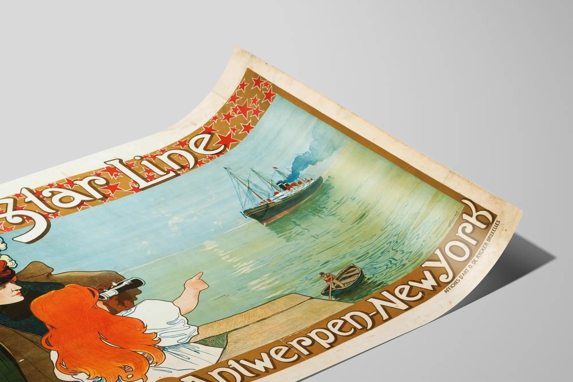 Dieses Vintage-Poster der Red Star Line Antwerpen-New York ist ein bemerkenswertes Stück, um Ihre Wanddekoration mit einem Hauch von Geschichte und maritimer Nostalgie zu bereichern. Es zeigt eine Szene, in der eine elegante Frau mit einem mit Federn verzierten Hut und ein junges Mädchen mit roten Haaren in die Ferne blicken, während ein Passagierschiff den Hafen verlässt – ein Symbol für die transatlantische Reise zwischen Antwerpen und New York. Das Mädchen benutzt ein Fernglas und zeigt mit dem Finger auf das Schiff, was den Eindruck von Abschied und Abenteuer verstärkt. Das Passagierschiff, detailliert mit rauchenden Schornsteinen und Masten, spiegelt sich sanft auf einem ruhigen Meer unter einem sanften blauen Himmel wider. Die roten Sterne oben auf dem Poster und die vintage Typografie mit dem Namen „Red Star Line“ sowie den Zielorten „Antwerpen-New York“ unterstreichen die Retro-Ästhetik und den Jugendstil des frühen 20. Jahrhunderts. Dieses Poster vereint ein historisches Zeugnis mit einem außergewöhnlichen Dekorationsobjekt, ideal für eine Wandgestaltung im Wohnzimmer, Büro oder einem Themenraum über Reisen oder maritimes Erbe. Die Komposition verbindet Feinheit in den Details der Figuren und des Schiffs mit einer Harmonie aus warmen und maritimen Farben, was ein angenehmes visuelles Gleichgewicht schafft. Ob Sie Liebhaber alter Poster, Reiseschilder oder einfach nur einen vintage- und eleganten Charakter in Ihrem Zuhause schaffen möchten – dieses Red Star Line-Poster ist perfekt, um eine einzigartige und charmante Atmosphäre zu kreieren. Es lässt sich mühelos in jeden Einrichtungsstil integrieren, sei es klassisch, retro oder sogar modern, dank seines klaren Designs und seiner natürlichen Farbtöne. Machen Sie dieses Poster zum Blickfang Ihrer Wanddekoration für eine Atmosphäre, die zum Reisen, Träumen und Entdecken einlädt.