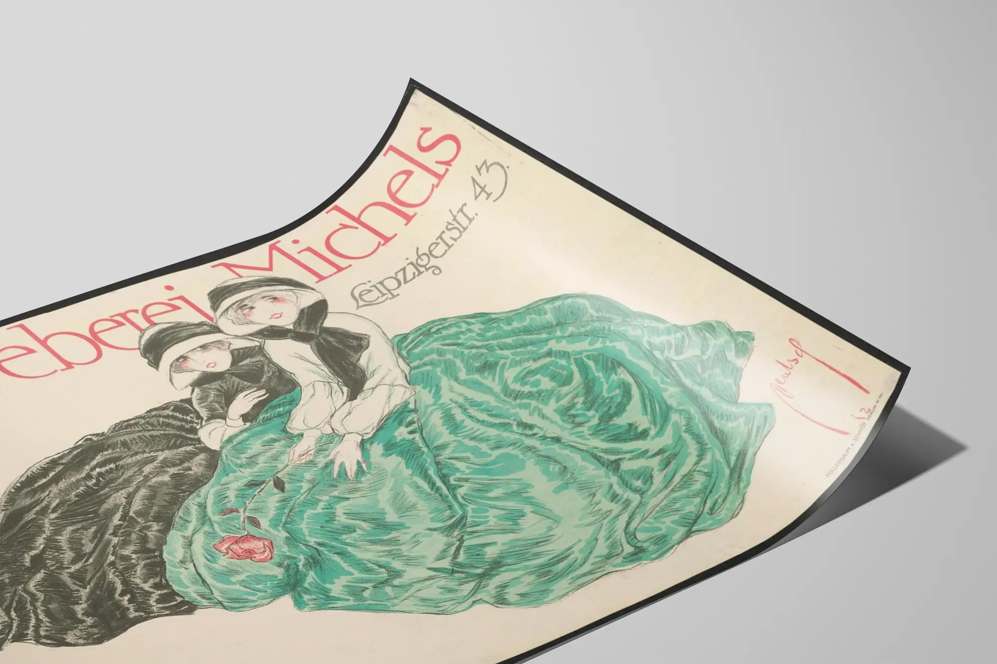 Dieses Vintage-Poster der Seidenweberei Michels ist ein elegantes grafisches Stück, das sich perfekt in eine Wanddekoration im Retro- oder Jugendstil einfügt. Es zeigt zwei sitzende Frauen, gekleidet in große, voluminöse Stoffröcke mit texturierten Effekten, die eine zarte und sorgfältige Illustrationsarbeit unterstreichen. Die Frau im Vordergrund hält eine rote Rose, die dem Gesamtbild eine subtile Farbtupfer und Romantik verleiht. Der Zeichenstil ist typisch für alte Werbeplakate, der die Schlichtheit der Formen mit raffiniertem Einsatz von Schattierungen verbindet, um Sanftheit und Weiblichkeit zu vermitteln. Der Schriftzug „Seidenweberei Michels“ oben sowie die Adresse „Leipzigerstraße 43“ verleihen diesem Poster einen authentischen Eindruck und verstärken seine Anziehungskraft für Liebhaber von Wanddekorationen im Vintage-Stil. Dieser Poster-Typ kann genutzt werden, um eine Wand in einem Wohnzimmer, Schlafzimmer oder Arbeitsraum zu schmücken, und bringt eine künstlerische Note, die an vergangene Epochen erinnert. Im Posterformat lässt es sich leicht in verschiedene Rahmen einfügen, um sich an zeitgenössische oder klassischere Stile anzupassen, und verleiht Ihrem Interieur einen Hauch von Charme und Eleganz. Die feinen Details wie die Drapierung der Stoffe und die zarten Linien um die Gesichter betonen die grafische Qualität dieses Werkes und machen es ideal für eine elegante Wanddekoration. Dieses Poster ist eine ausgezeichnete Wahl für diejenigen, die Kunst und Geschichte in ihrer Wandgestaltung verbinden möchten, indem sie ein visuell ansprechendes Stück mit starker ästhetischer Identität hinzufügen.
