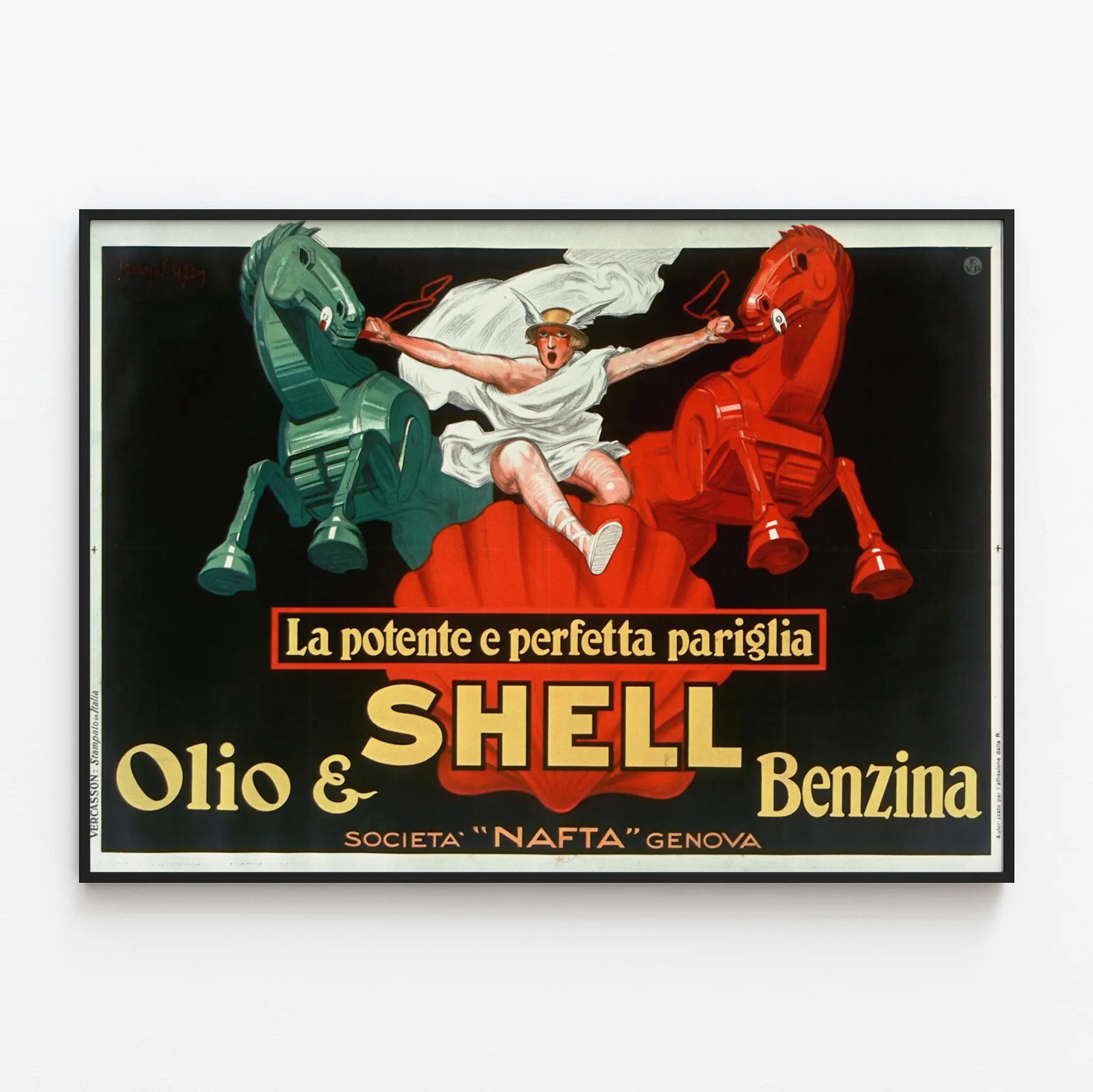 Dieses Vintage-Poster von Shell hebt die Kraft und die Perfektion der italienischen Marke für Öl und Benzin hervor. Dargestellt durch ein ikonisches Design zeigt es eine zentrale Figur in Weiß zwischen zwei stilisierten mechanischen Pferden, eines grün und das andere rot, die die Antriebskraft symbolisieren. Der dunkle Hintergrund bildet einen starken Kontrast zu den leuchtenden Farben der Hauptelemente und verleiht dieser Wanddekoration eine kraftvolle visuelle Wirkung. Dieses Poster ist perfekt für ein Retro- oder Industrieambiente, ideal für Liebhaber von Vintage-Wanddekoration, alten Plakaten oder Werbeplakaten. Es stellt ein originelles Bild dar, das einem Raum Charakter und Geschichte verleiht – sei es im Wohnzimmer, Büro, Garage oder in einem Bereich, der der Automobilleidenschaft gewidmet ist. Die Begriffe "Olio & Benzina" erinnern an die Verwendung der Shell-Produkte und unterstreichen das Thema Kraftstoff und Mechanik. Der Einsatz dieses Posters als Dekorationselement erzeugt eine dynamische und eindrucksvolle Wirkung, die sowohl die grafische Ästhetik als auch die Nostalgie alter Werbeanzeigen betont. Dieses dekorative Plakat ist eine perfekte Wahl, um eine Wand mit einem künstlerischen und historischen Objekt zu bereichern, das sowohl Sammler als auch Liebhaber von Vintage-Design begeistern wird.