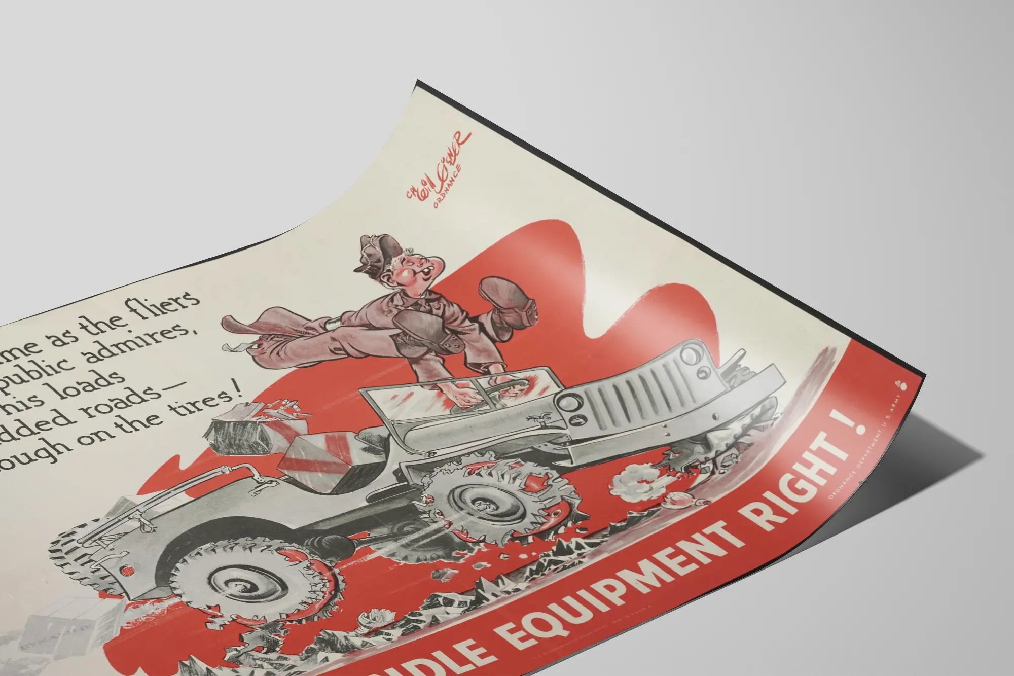 Dieses vintage Wandposter für die Dekoration hebt eine eindringliche Botschaft über die Vorsicht im Umgang mit Ausrüstung hervor. In einem retro- und humorvollen Stil illustriert, zeigt es eine Figur namens Joe Dope, die in einem Militärjeep mit zerfetzten Reifen stürzt. Dieses originelle Bild, das karikaturhaften Zeichnungen und handgeschriebenen Text kombiniert, lenkt die Aufmerksamkeit auf die Bedeutung des richtigen Umgangs mit Geräten, um Unfälle und Schäden zu vermeiden. Das Poster spielt mit einer Farbpalette, die hauptsächlich in Rot, Grau und Schwarz gehalten ist, was den Kontrast und die Lesbarkeit der Botschaft verstärkt. Sein gereimter Text verleiht eine poetische und einprägsame Dimension, die dazu ermutigt, nicht ungeschickt zu sein („Sei kein Dummkopf! Richtig mit der Ausrüstung umgehen!“), eine zeitlose Warnung, die ihren Platz in industriellen Umgebungen, Lagerräumen oder in einem militärisch oder vintage inspirierten Interieur findet. Dieses Wanddekorationstück kann auch Kunstliebhaber militärischer Grafik und historischer Poster begeistern und bringt eine originelle und lehrreiche Note an die Wand. Perfekt als Poster oder gerahmt als Bild, fügt sich dieses vintage Poster dank seines sowohl grafischen als auch erzählerischen Designs in verschiedene Atmosphären ein. Eine ideale Wahl für diejenigen, die Kunst, Geschichte und eine praktische Botschaft in ihrer Inneneinrichtung verbinden möchten.